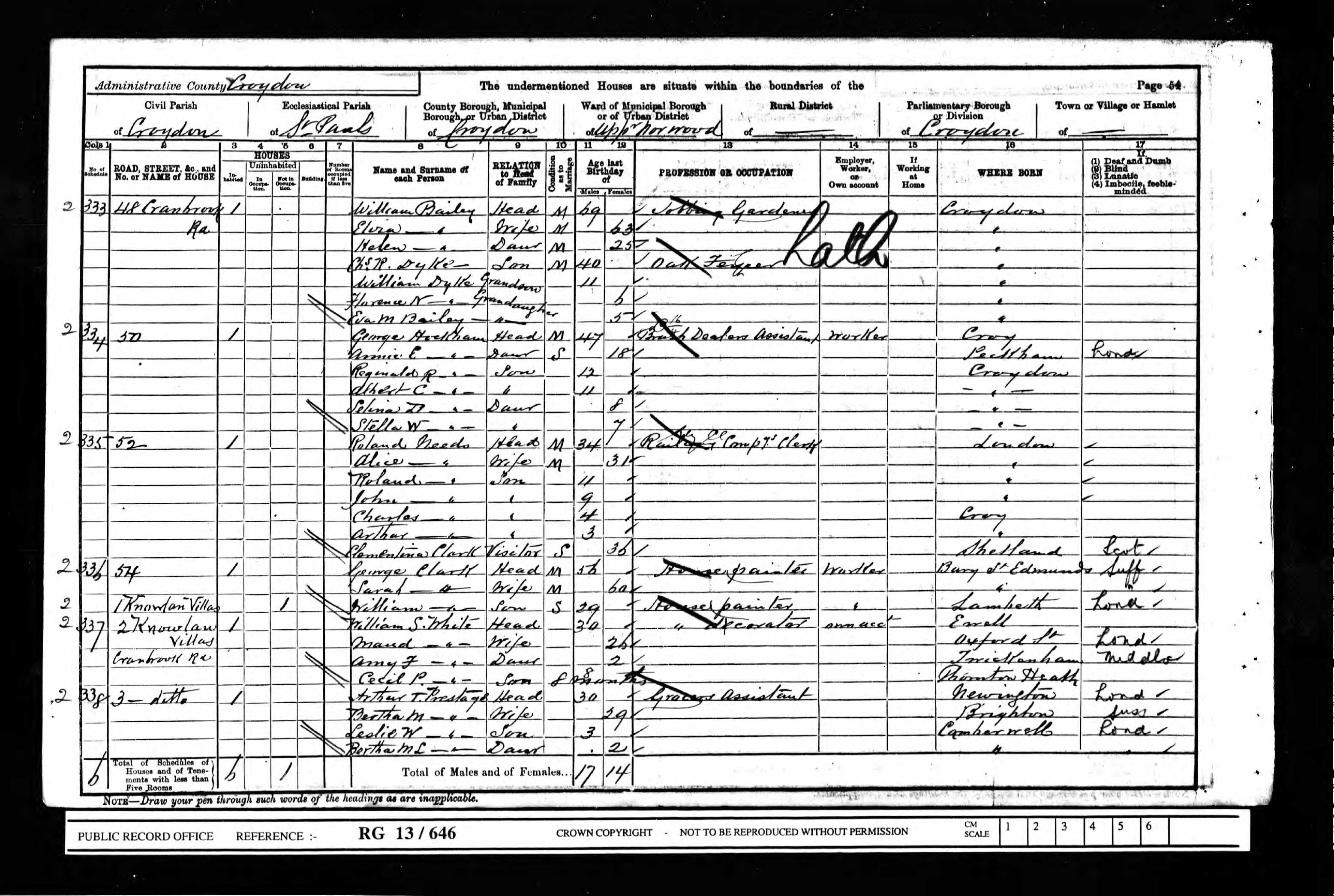 1. Census: England, 31 Mar 1901, 48 Cranbrook Rd Croydon SRY. Chs R is recorded as a son married aged 40 an oak fencer born Croydon Charles married Alice Frances LOCKYER [21401] [MRIN: 7696], daughter of James LOCKYER [21743] and Unknown, on 2 Oct 1887 in St Paul Thornton Heath SRY. (Alice Frances LOCKYER [21401] was born about 1864.) |