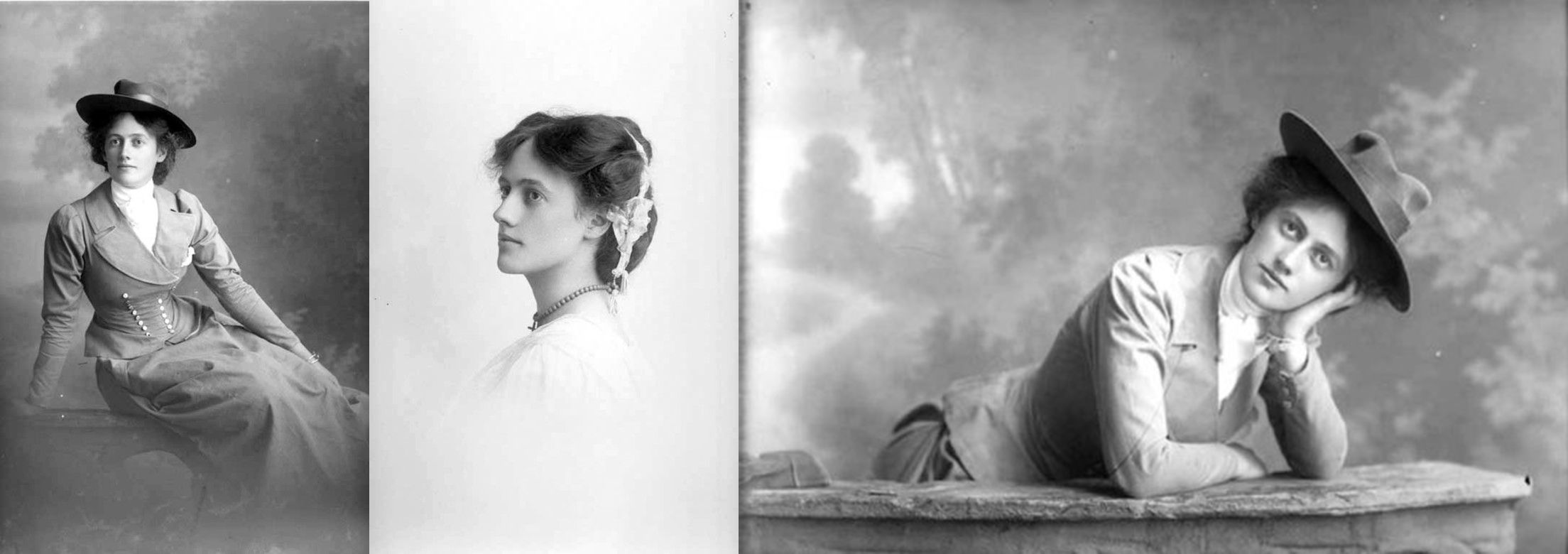 1. Muriel Gwendoline de Bourbel: Photographs by J H Schmidt, 1909, Auckland, N.Z. 3/4 portrait of Miss de Bourbell seated, wearing a mid-coloured tailored suit with two rows of light coloured buttons on jacket, a light coloured scarf at neck, a brooch on scarf and a dark coloured hat. Other poses by Muriel Bourbel. Images Courtesy Auckland Library