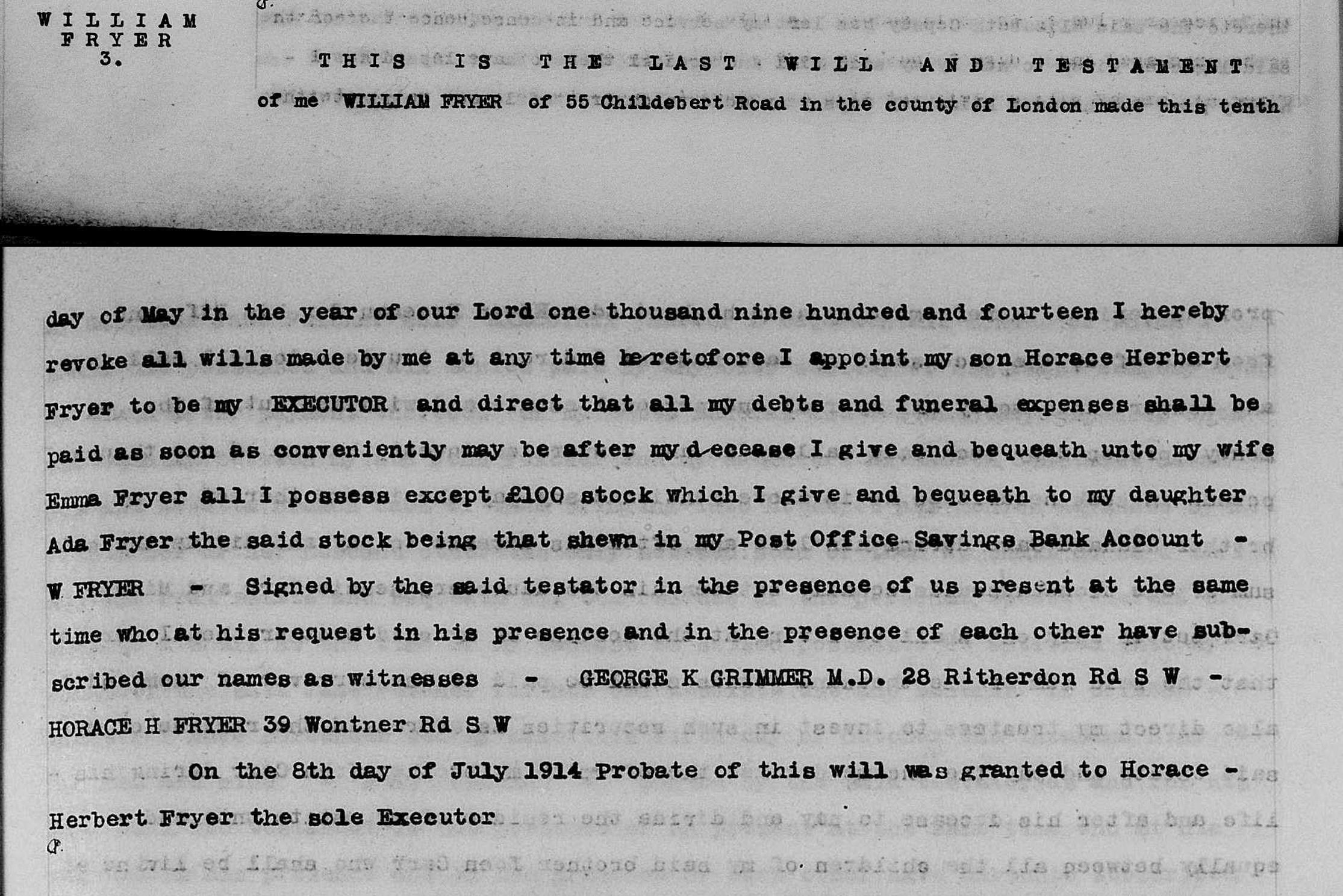 4. William Fryer: Will, 10 May 1914. William married Emma Ann KENNA [25396] [MRIN: 9127], daughter of Thomas KENNA [25400] and Mary [25401], on 29 Jun 1865 in St Margaret Rochester KEN. (Emma Ann KENNA [25396] was born about 1842 in Liverpool LAN, baptised on 12 Jun 1842 in St Phillip Salford LAN and died circa 1925 in Wandsworth LND.) |