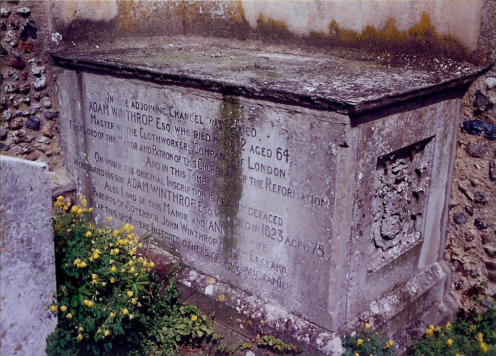 Lord of the Manor, Adam Winthrop, III. Esq Birthdate: August 10, 1548 (74) Birthplace: Groton Manor, Suffolk Death: March 28, 1623 (74) Groton Manor, Suffolk, England Place of Burial:St Bartholomew Churchyard, Groton, Suffolk, England Immediate Family: Son of Adam Winthrop, of London, later of Groton Manor ; Adam Winthrop and Agnes or Anne or Alice Mildmay Husband of Alice Winthrop and Anne Winthrop Father of infant Still Winthrop ; Sarah Winthrop ; infant Anne Winthrop ; Anne Fones, (Younger) ; Gov. John Winthrop, Massachusetts Bay Colony and 3 others Brother of Agnes Warriner ; Alice Mildway ; Bridget Alabaster ; Mary Celie ; John Winthrop, of Groton Manor, later of Aghadowne and 3 others Half brother of Thomas Winthrop ; William Winthrop ; Christopher Winthrop ; Bridget Winthrop and Thomas Winthrop Occupation: Attorney, Master of Clothworkers/ Lawyer, Farmer. Ref: Mark Harold Melmed Last Updated: May 25, 2017