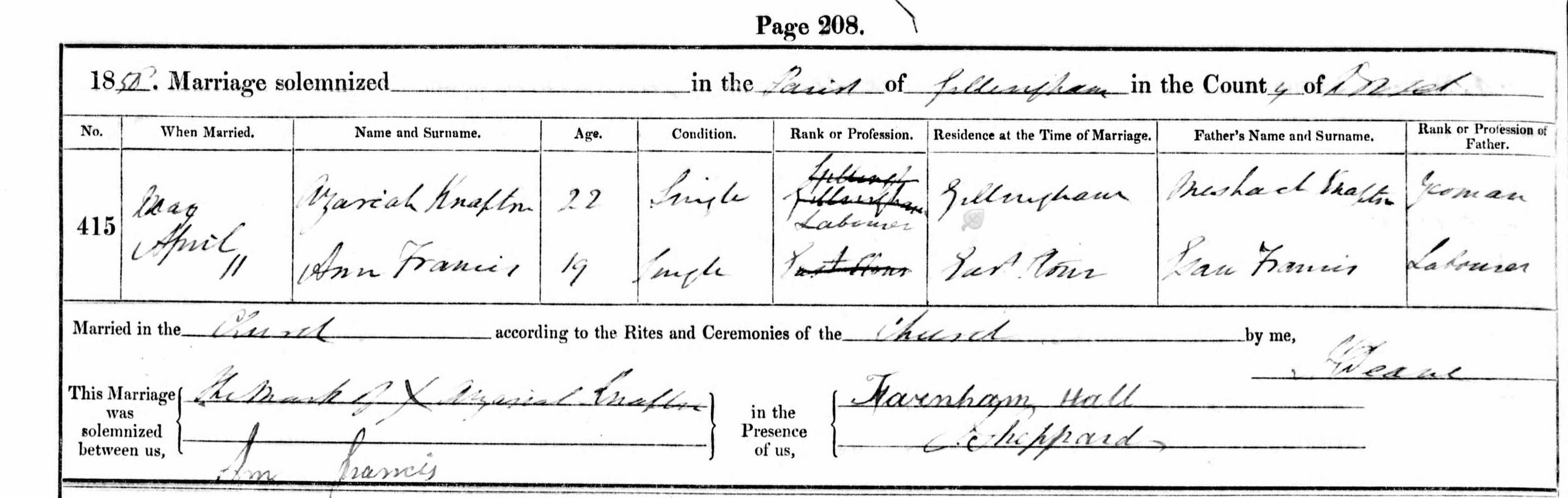 1. Census: England, 5 Apr 1891, Gillingham DOR. Benjamin is recorded as head of house married aged 55 a coal merchant born Milton Dorset. Azariah married Ann FRANCIS [26883] [MRIN: 4972], daughter of Esau FRANCIS [27396] and Grace HIX [27397], on 11 Apr 1858 in Gillingham DOR. (Ann FRANCIS [26883] was born circa 1841 in East Stour DOR and was baptised on 21 Mar 1841 in East Stower DOR.) |