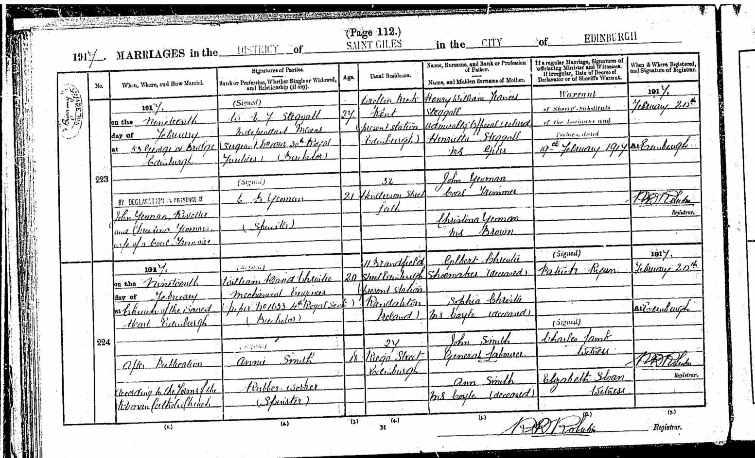 1. Census: England, 5 Apr 1891, Thornton Heath Croydon SRY. William E F is recorded as a son aged 7 born Newington LND 2. Census: England, 2 Apr 1911, 959 Wandsworth Rd, London. William Edward F Steggall is recorded as head of my one room house aged 27 married one year no children and Engineer (Saw Mills) a worker born Kennington Surrey. William married Eva Norah MARTIN [30227] [MRIN: 10667], daughter of William S MARTIN [31066] and Mary A [31067], 3rd Qtr 1910 in Camberwell LND. (Eva Norah MARTIN [30227] was born on 24 Sep 1892 in Peckham SRY and died on 5 Dec 1960 in Whipps Cross ESS.) William next married Christina Brown YEOMAN [30286] [MRIN: 10690] in 1917 in Scotland. (Christina Brown YEOMAN [30286] was born on 18 Nov 1895 in Leith SCT and died on 17 Aug 1960 in Edinburgh.) |