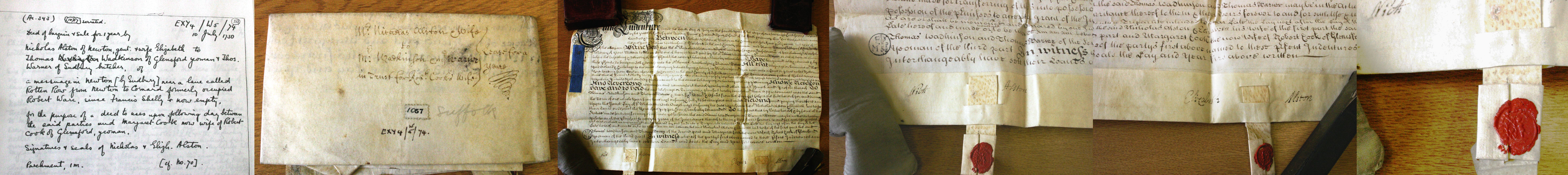 1. Nicholas & Elizabeth Alston: Indenture, 10 Jul 1730, Suffolk. Catalogue entry Bury St Edmunds Record Office Suffolk. (Ac. 343) (10)57 serratedEXY4 / W5 / 74 10 July 1730 Deed of bargain and sale for one year by Nicholas Alston of Newton Gent and wife Elizabeth to Thomas Wadkinson of Glemsford yeoman and Thomas Warner of Sudbury butcher of a messuage in Newton (by Sudbury) near a lane called Rotten Row from Newton to Cornard formerly occupied Robert Ware since Francis *Shelly and now empty in the purpose of a deed to uses upon following day between the said parties and Margaret Cook now wife of Robert Cook of Glemsford yeoman. Signatures and seals of Nicholas and Elizabeth Alston. Parchment IM.(of no. 70)
