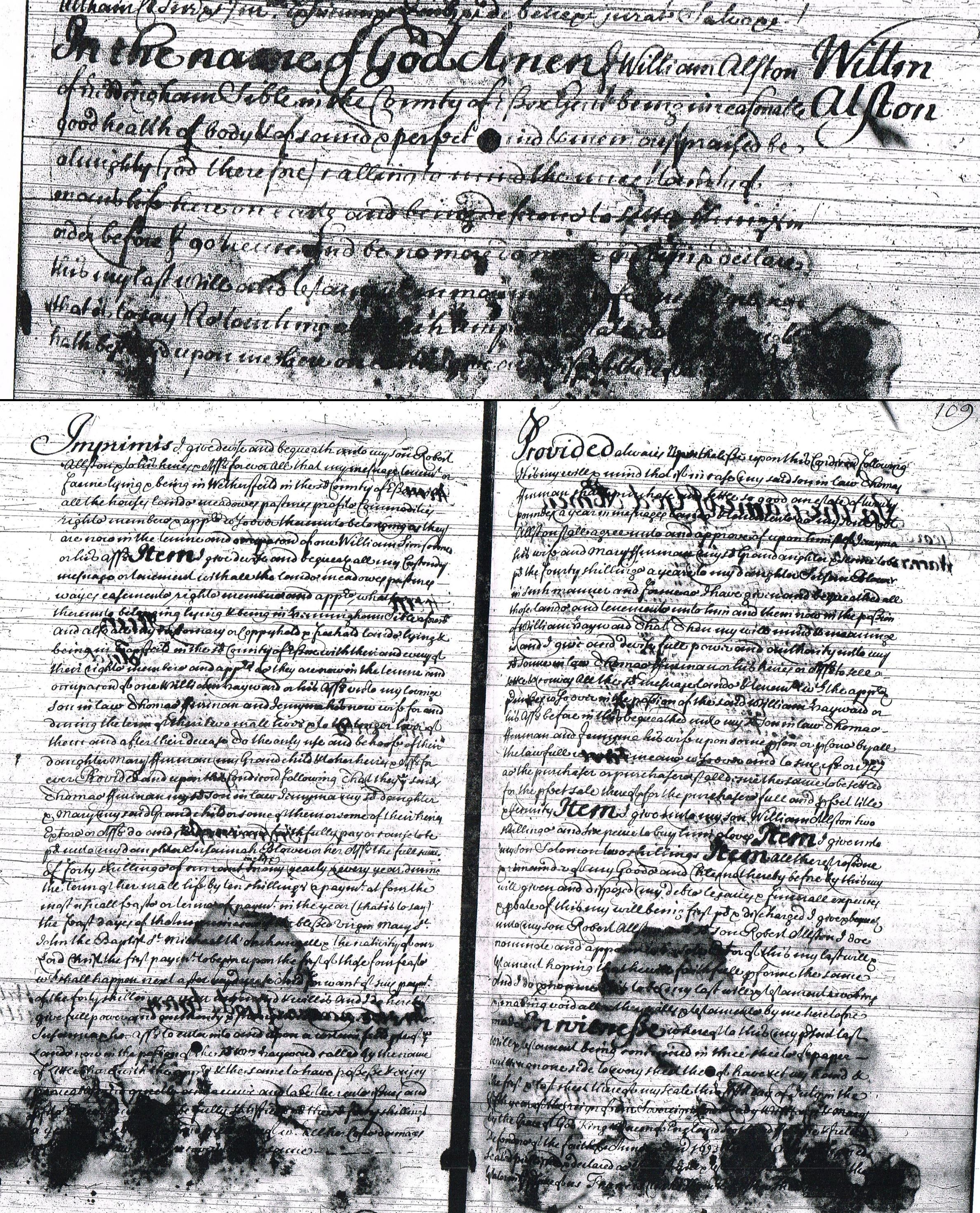 1. William Alston: Will, 1693. WILL of WILLIAM ALSTON of SIBLE HEDDINGHAM. July 5th Year of the Reign of William & Mary (1693) To Robert his son his messuage and lands in Wethersfield ESS in the tenure and occupation of William Simson? and all other assets after the payment of his debts and bequests. To Thomas Firman his son-in-law and Jemyma his wife all his messuage and lands in Heddingham Sible for their lives, and then to their daughter Mary his granddaughter, provided they do faithfully pay; to his daughter Susannah 40/- for life in four payments annually of 10/- To his son William Alston 2/6 to buy gloves. To his son Solomon Alston 2/- Robert Alston his son is appointed his Executor. Proved 5 May 1699 Ref. ESS PRO D/ABR 14 108. (Wills reel 8) Researchers copy smudged and difficult to read, the transcripton may be in error.
