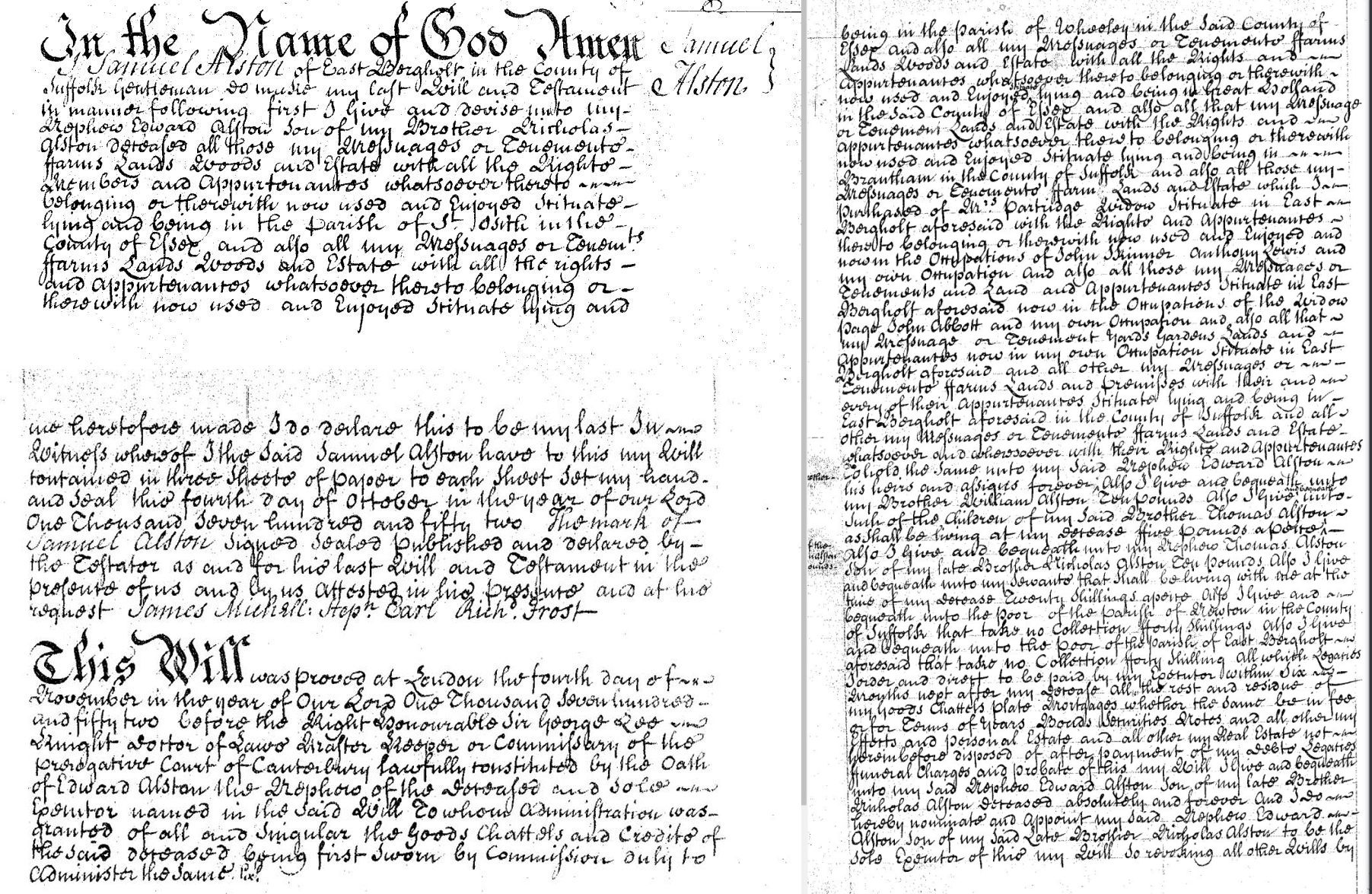 1. Samuel Alston: Will, 1752, East Bergholt SFK. The Will of Samuel Alston of East Bergholt, co. Suffolk gentleman Dated 4 October 1752. I give to my nephew Edward Alston and his heirs son of my brother Nicholas Alston deceased all my messuages farms, lands, woods and estates (with all rights thereto belonging), situate in the parish of St. Osith, co. Essex also my messuage farms lands woods &c. in the parish of Wheeley, co. Essex, my messuage lands &c. in Great Holsand, co. Essex-the same in Brantham, co. Suffolk the same purchased from Mrs. Partridge widow in East Bergholt, now in the occupation of John Skinner, Anthony Lewis and my own occupation-also my messuage lands &c, in East Bergholt, now in the occupa- tion of Widow Page, John Abbott and myself I give to my brother Thomas Alston L10 I give to my brother William Alston L10 Also to such of the children of Thomas Alston as shall be living at my decease L5 each I give to the children of my brother William L5 each I give to my nephew Thomas son of my brother Nicholas L10 I give to my servants 20/- each I give to the poor of the partsh of Newton 40/- I give to the poor of the parish of East Bergholt 40/- The rest of my goods, chattels, plate, mortgages, bonds, securities, notes and the residue of my real and personal estate I give to my said nephew Edward Alston and appoint him sole executor of this my will Mark of SAMUEL ALSTON x Witnesses: James Michell, Hepn Earl, Richard Frost Proved the 4th November 1752 by Edward Alston nephew of deceased and sole executor named in will. Alstoniana Pg 139.