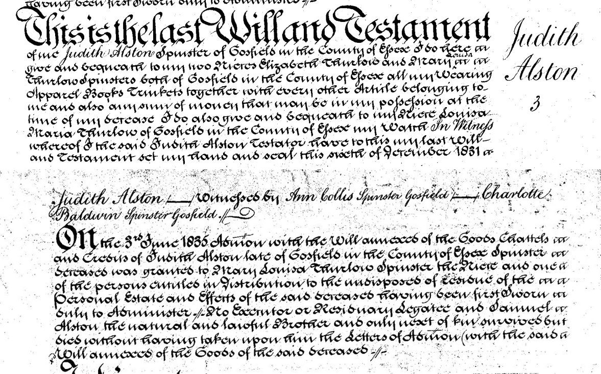 1. Judith Alston: Will, 1831, Gosfield ESS. THE WILL of JUDITH ALSTON of GOSFIELD Dated 6 Dec 1831 This is the last Will and Testament of me Judith Alston spinster of Gosfield in the County of Essex. I do herein give and bequeath to my two nieces Elizabeth Thurlow and Mary Louisa Thurlow spinsters both of Gosfield in the County of Essex all my wearing apparel books trinkets together with every other article belonging to me and also any sum of money that may be in my possession at the time of my decease. I do do also give and bequeath to my niece Louisa Maria Thurlow of Gosfield my watch In witness whereof I the said Judith Alston Testator have to this my last Will and Testament set my hand and seal this sixth of December 1831 Judith Alston Witnesses: Ann Collis spinster Gosfield, Charlotte Baldwin spinster Gosfield. Administration granted 3 June 1835 to Mary Louisa Thurlow spinster niece and heir having been sworn only to Administer - Samuel Alston the natural and lawful brother and only next of kin survived but died without having taken upon him Letters of Admon with said Will and annexes of the goods of the said deceased. Ref PROB 11/1847 Q336