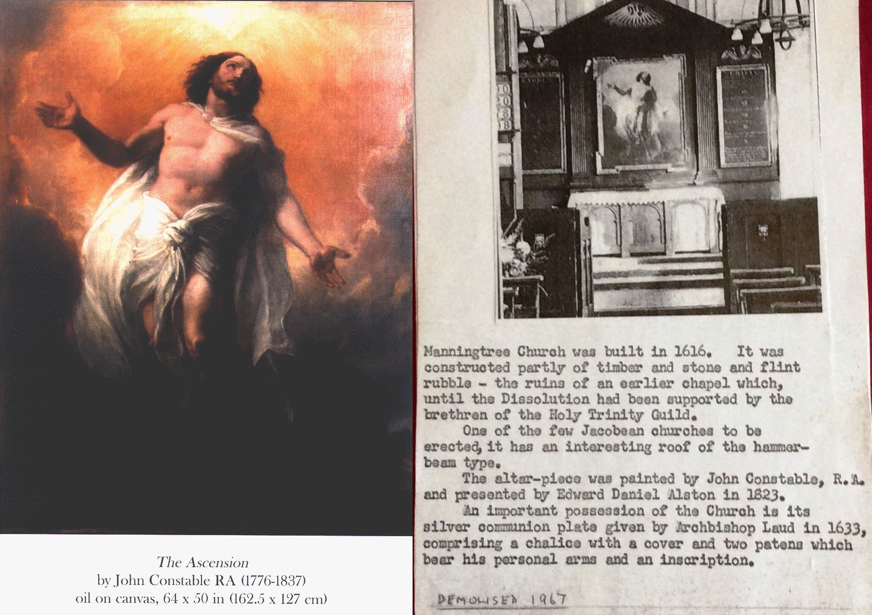 Kellys Directory 1894 Manningtree ESS - "A large oil painting representing our Saviour was the gift of Edward Daniel Alston Esq., in 1823" The painting by Constable was hanging in Dedham Church in 2003, however the following exerpt indicates its future may not be finally there.