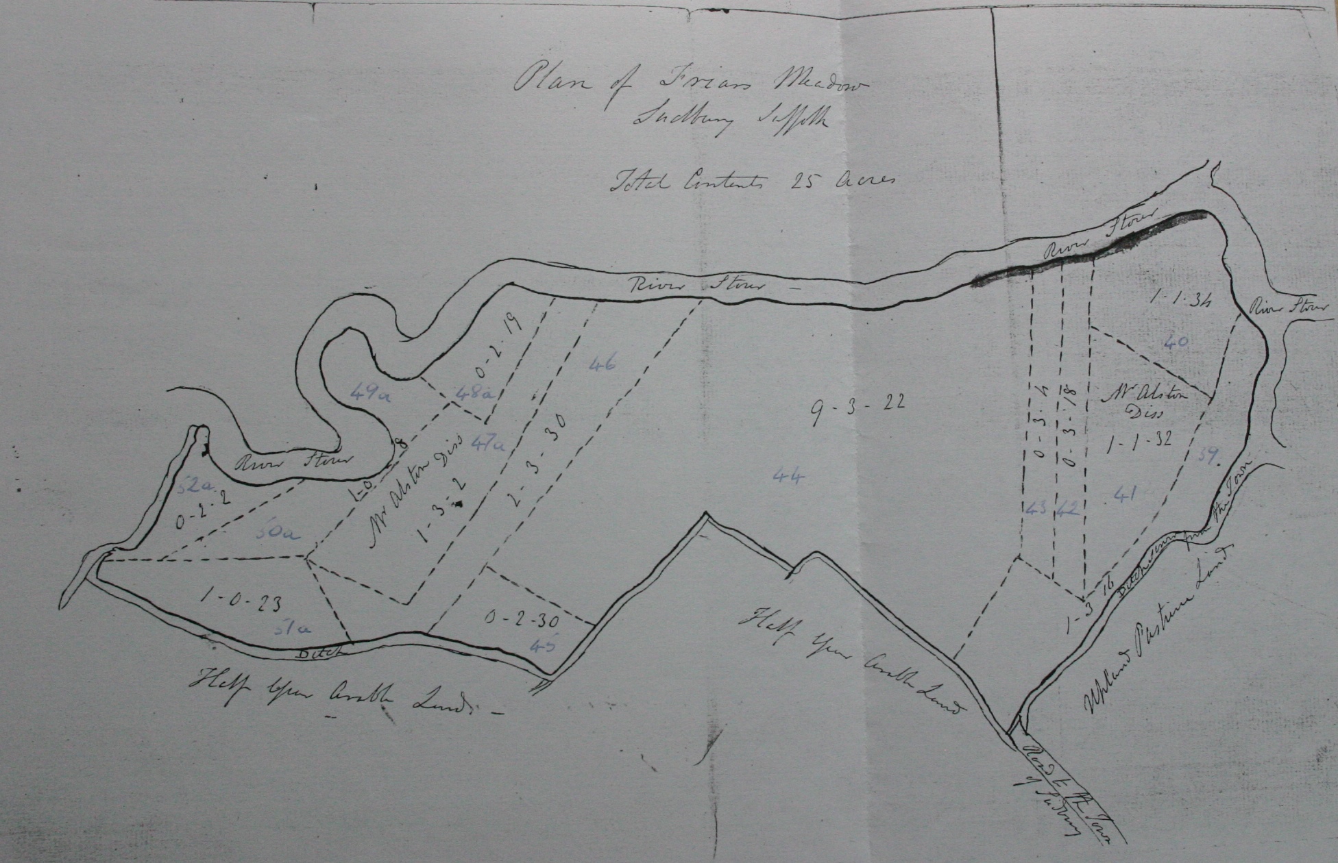 1. Edward Alston: Land owned by Edward Alston, 1834, Friars Meadow Sudbury SFK. Sudbury July 1834 You have two pieces of Land upon the Common Meadow in this Town containing together 3 Acres belonging to your Farm at Newton in the occupation of Mr John Dyer. I have a client who has a piece of Land adjoining yours & if you are disposed to sell it he would purcnase it I trouble you with this under the impression that as these pieces are three or four Miles distant from your Farm they are no object to you to retain You are probably aware that this ideadow is Lammas Land over which the Burgesses of this Town depasture their Cattle & that the owners are only entitled to the Crop of Grass the Land is in consequence of this not improvable beyond the value of the Cut of Grass & the Meadow is subject to Floods I send you a Plan of the Meadow taken from an Map of the Town, one of your Pieces of Land are at each end of the Meadow. I shall be obliged by the favor of a reply & am Sir Your obbt Serv. Jno Chas Gooday.