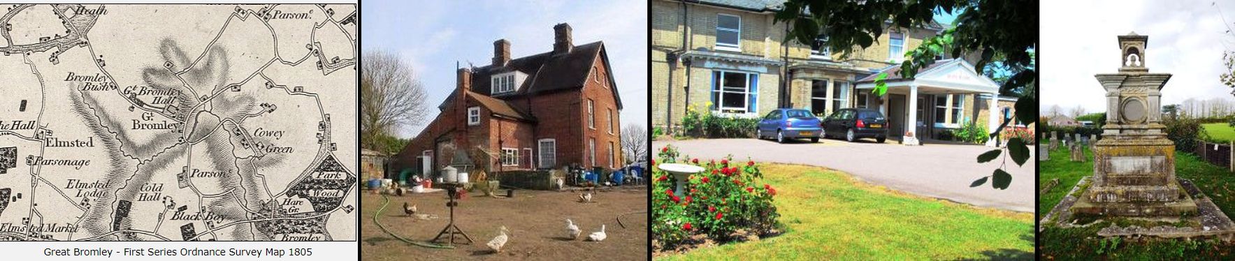6. Edward John Alston: Map of village, Cold Hall, Gt Bromley Hall, Alston Tomb. Edward and family first lived at Cold Hall then leased Gt Bromley Hall for more than 40 years (the records seem to suggest that the Hall remained in the ownership of the Ashburton family throughout this period). It is interesting to note that though the family left the Hall in 1886, members of the family continued to be buried in the family vault. There are references on the Monument to Edith Caroline Alston [3949] who died in 1947 aged 77, and Ethel Violet [3950] who was buried there in 1950 at the age of 60. When the Alston family left the Hall in 1886, an extensive sale of all of their possessions and artefacts was held. A total of 430 lots was offered for sale including "fine glassware, Spode, Lowestoft and other china", a light single Brougham, a Phaeton, a Gig and a "four wheel carriage (Char-a-banc)"....A Feather bed with two bolsters and two pillows realised £1-0-0, a harmonium £1-10-0, and a 6 -octave Pianoforte in mahogany case £6-10-0.The Sale Catalogue also noted that "The Residence with stabling, coach house, pleasure grounds, park-like pastures and lake" were to let. Ref. "Our House" by Colin File, Seven Rivers Gt Bromley Essex.