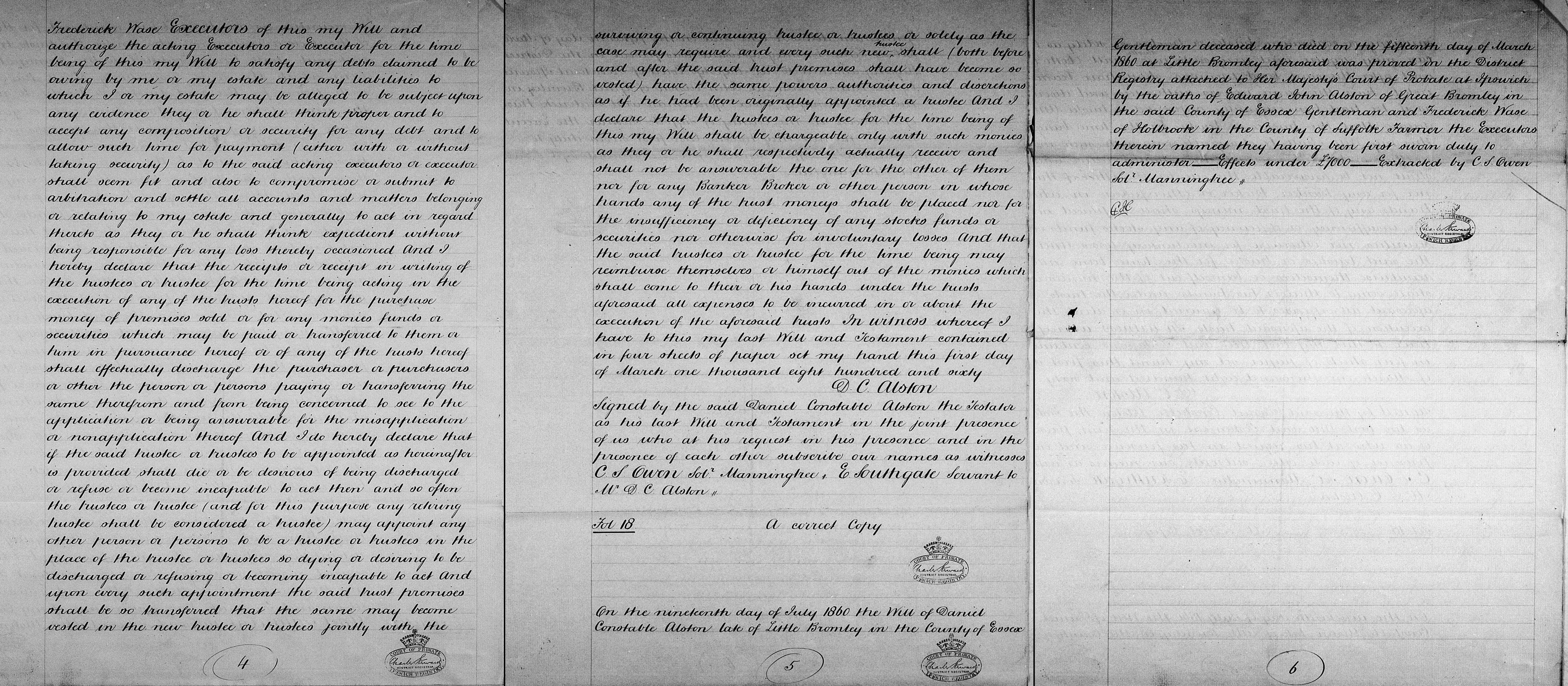 Gentleman deceased who died on the fifteenth day of March 1860 at Little Bromley aforesaid was proved in the District Registry attached to Her Majesty's Court of Probate at Ipswich by the oaths of Edward John Alston of Great Bromley Essex Gentleman and Frederick Wase of Holbrook Suffolk farmer the executors having been first sworn duly to administer - effects under £7,000 - extracted by C. S. Owen Sol'r Manningtree