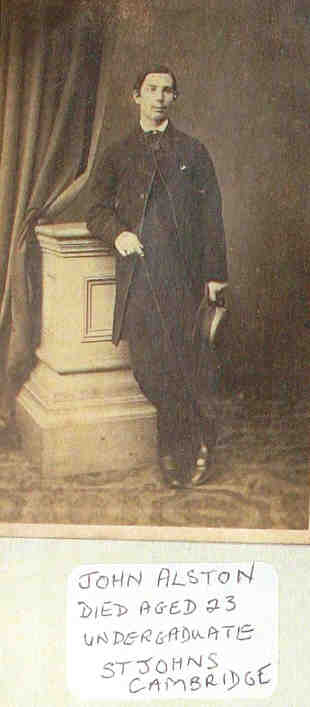 Deaths. Alston - 25th inst., at Dennington, John E. D. Alston, B.A., of Clare College, Cambridge, aged 23 years. Ipswich Journal 29 August 1863.