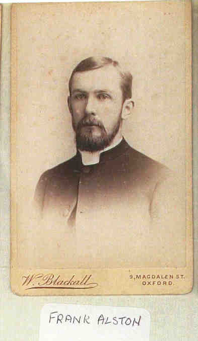 Frank Simpson Alston Birth Place: Dennington, Suffolk, England Christening Date: 17 Jan 1864 Christening Place: Dennington, Suffolk, England Father: Edward Constable Alston Mother: Anna Maria Simpson Frank was Educated Marlborough, Exeter College Oxford BA 18/6/85, MA. Ordained Deacon 5 June 1887, curate of Coningsby , Priest Lincoln 27 May 1888, vicar of Wispington 1890, vicar West Ashby Lincs. 1896.