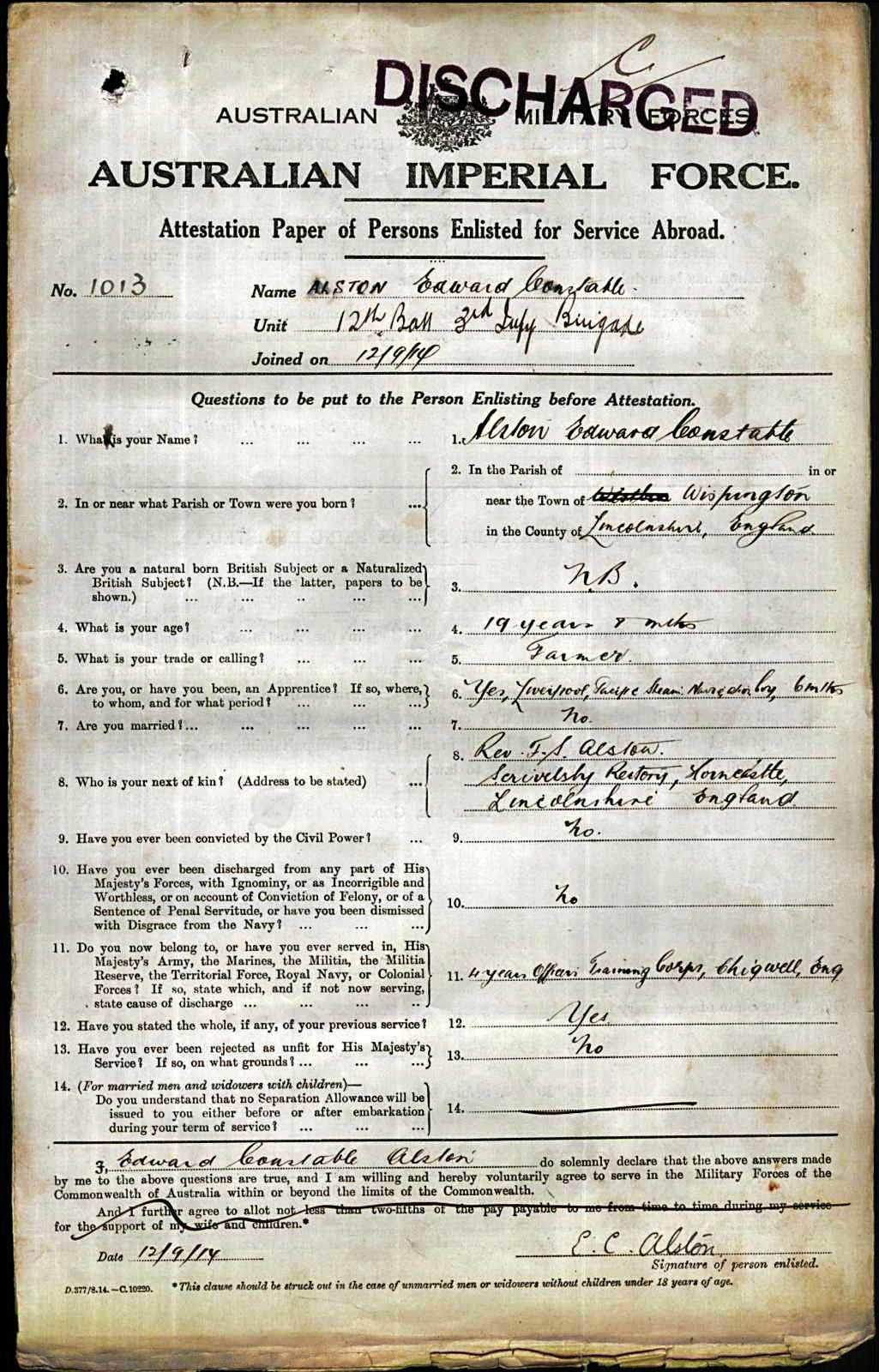 Australian Imperial Force Attestation Paper of Persons Enlisted for Service Abroad. No 1013 Alston Edward Constable Unit 12th Infantry Batt 3rd Supply Brigade Joined 12 Sep 1914. Born Wispington LIN Age 19yrs 8mths Farmer Apprenticeships, Liverpool Pacific Steam Navigation Co, 6mths. Not married Father Rev F S Alston Scrivelsly Rectory Horncastle LIN No convictions 4 yrs Officer Training Corps, Chigwell, England Never rejected unfit. Signed E C Alston 12 Sep 1914.