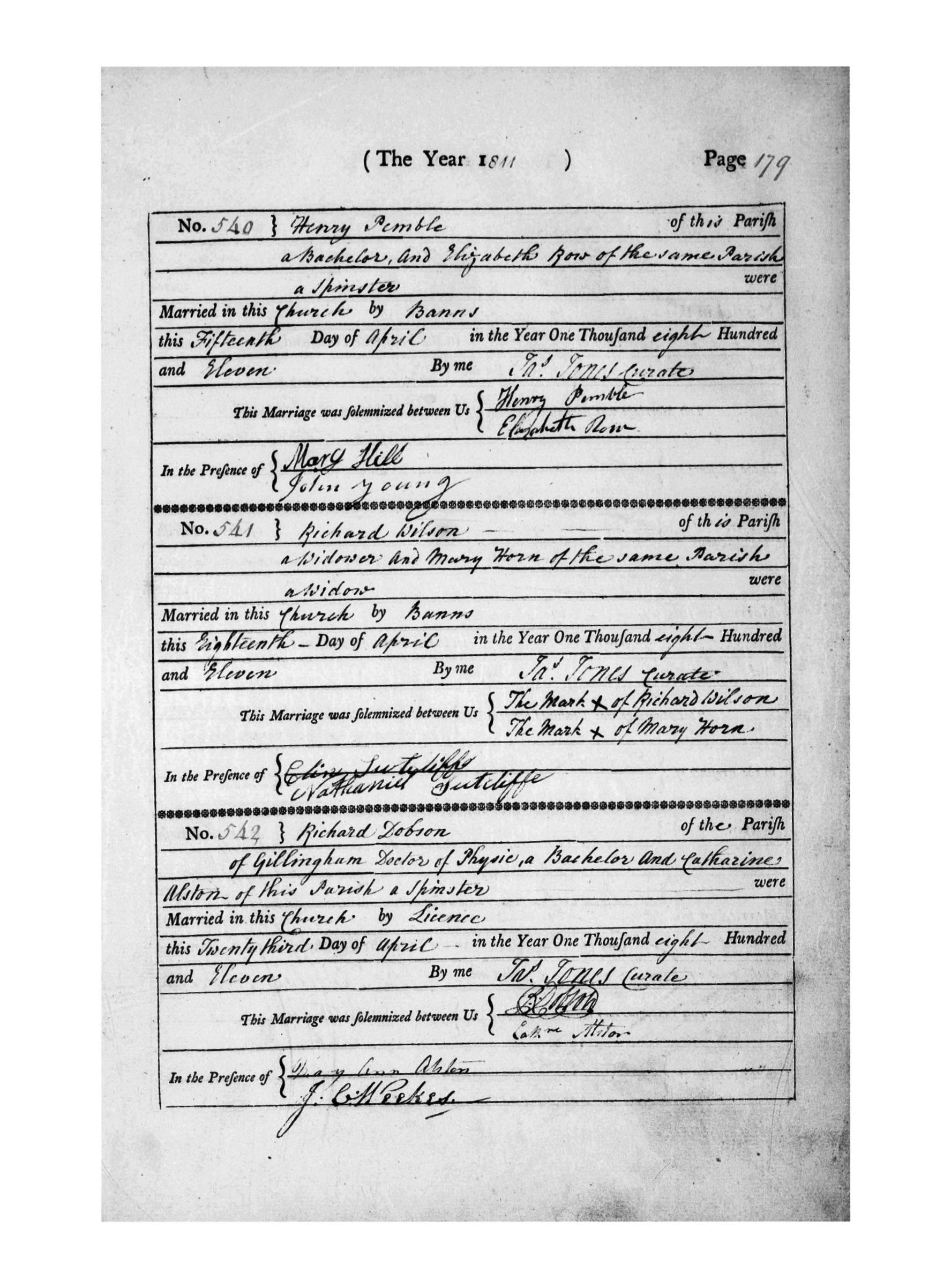 Katherine married Sir Richard DOBSON Kt. MD FRS [4001] [MRIN: 1371] on 23 Apr 1811 in St Nicholas Rochester KEN. (Sir Richard DOBSON Kt. MD FRS [4001] was born about 1774, died on 1 Sep 1847 and was buried on 9 Sep 1847 in St Mary's Chatham.) |
