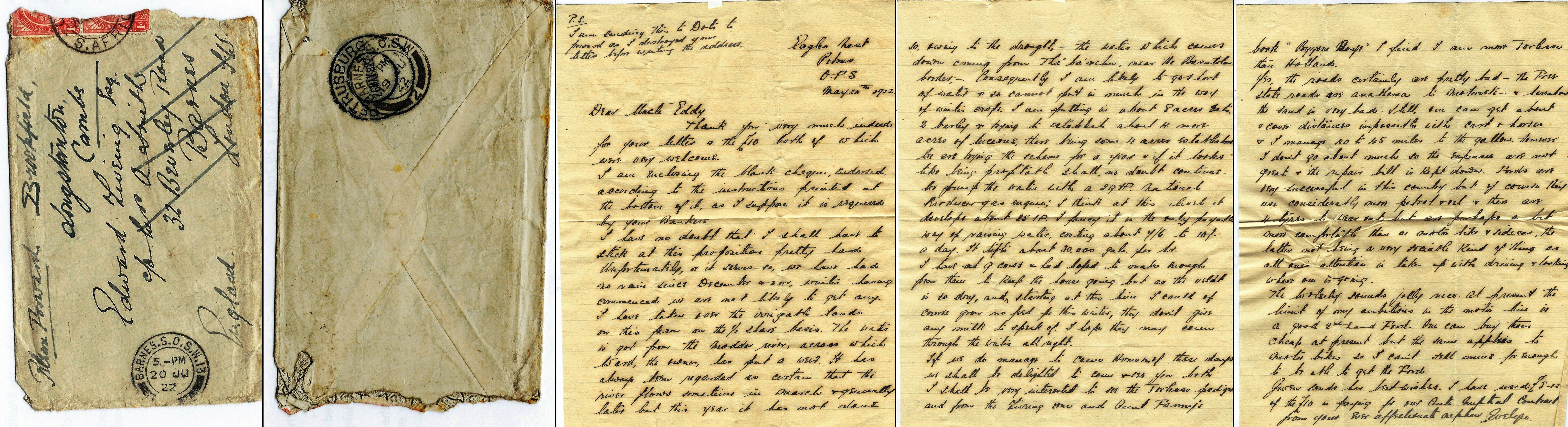 Eagles Nest Petrus OFS May 24th 1922. Dear Uncle Eddie Thank you very much indeed for your letter and the £101 both of which were very welcome. I am enclosing the blank cheque, endorsed according to the instructions printed at the bottom of as I suppose it is required by your Bankers. I have no doubt that I shall have to stick at this proposition pretty hard. Unfortunately, or it seems so, we have had no rain since December & Nov, winter having commenced we are not likely to get any. I have taken over the irrigatable lands on this farm on the half share basis. The water is got from the Modder [?] River, across which we and the owner put a weir. It has always been regarded as certain that the river flows sometime in Mar and generally later but this year it has not done Page 2 so, owing to the drought, the water which comes down coming from Tha'ba'ncher, near the Basutoland boarder, consequently I am likely to go short of water and so cannot put in much in the way of winter crops. I am putting in about 8 acres of oats to have barley and trying to establish about 4 more acres of lucerne, there being some 4 acres established we are trying the scheme for a year and if it looks like being profitable shall no doubt continue. We pump the water with a 29 hp National Producer gas engine, I think at this level it develops about 25 hp. I fancy it is the only payable way of raising water, costing about 7/6 to 10 shillings a day. It lifts about 30,000 gallons per hour. I have 9 cows and had hoped to make enough from these to keep the house going but as the veldt is so dry, and starting at this time I could of course grow no feed for this winter, they don't give any milk to speak of, I hope they may cover through the winter all right. If we do manage to come home one of these days will we shall be delighted to come and see you both. I shall be very interested to see the Torlesse pedigree and from the Liveing one and Aunt Fanny's book "Bygone Days" I find I am more Torlesse than Holland. Yes the road certainly are pretty bad \endash the Free State roads are anathema to motorists \endash and hereabouts the sand is very bad. Still one can get about and cover distances impossible with cart and horses and I manage 40 to 45 miles to the gallon. However I don't go about much so the expenses are not great and the repair bill is kept down. Fords are very successful in this country but of course they use considerably more petrol and oil and there are 4 tyres to wear out, but are perhaps a bit more comfortable than a motorbike and sidecar, the latter not be a very sociable kind of thing as all one's attention is taken up with driving and looking where one is going. The Wolseley sounds jolly nice. At present the limit of my ambitions in the motor line is a good second hand Ford. One can buy them cheap at present but the same applies to motorbike so I can't sell mine for enough to be able to get the Ford. Gwen sends her best wishes, I have used £8/12 of the £10 in paying for our Anti Nuptual Contract. From your ever affectionate nephew Evelyn. P.S. I am sending this to Dots to forward as I destroyed your letter before writing the address.