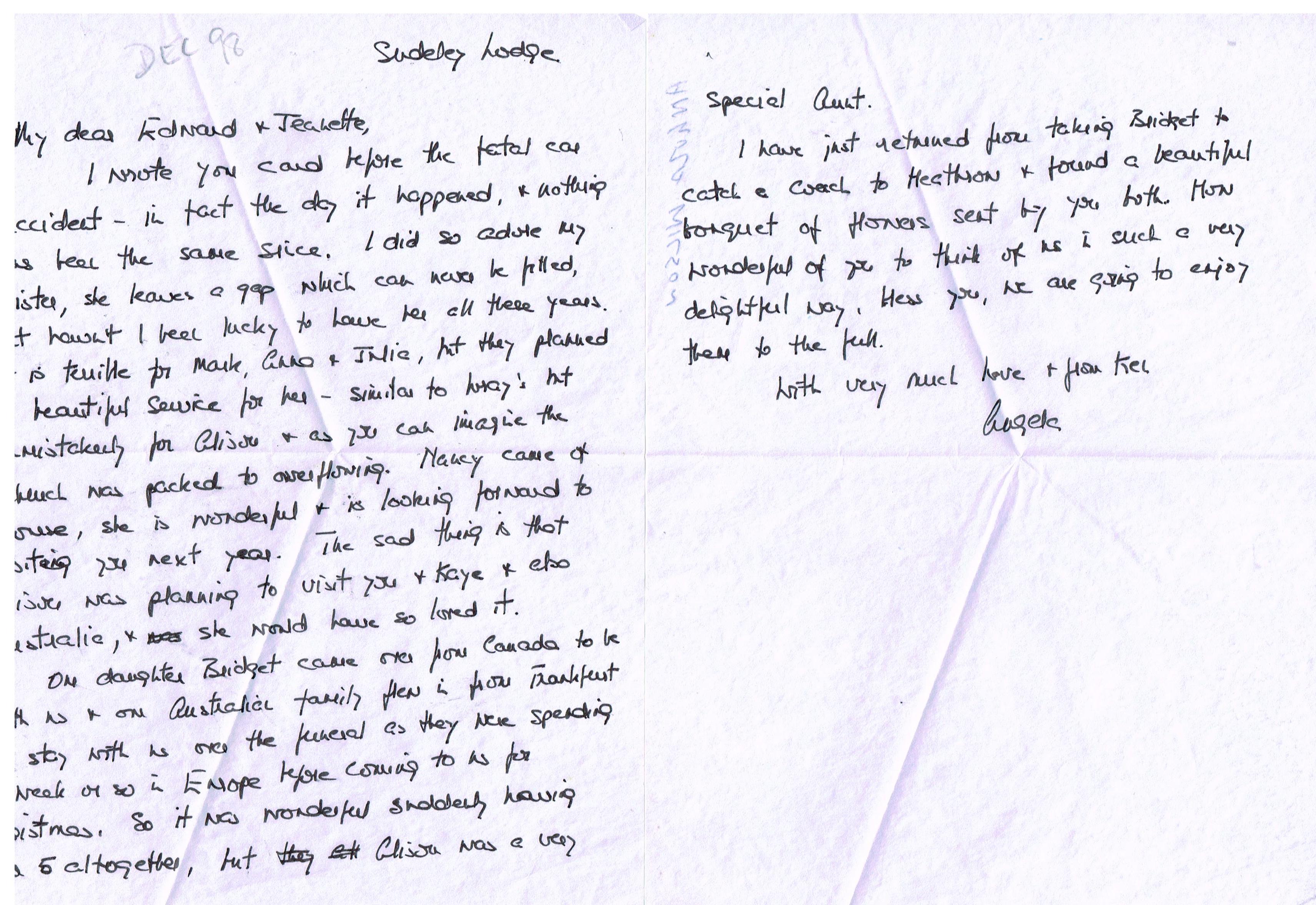 2. Angela Mary Fenn: Letter to Edward & Jeanette Fenn Auckland, Dec 1998, Sudeley Lodge Winchcombe GLS. Sudeley Lodge stop My dear Edward and Jeanette, I wrote your card before the fatal car accident \endash in fact the day it happened, and nothing has been the same since. I did so adore my sister, she leaves a gap which can never be filled, but haven't I been lucky to have her all these years. It is terrible for Mark, Anna and Julie, but they planned a beautiful service for her \endash similar to Wray's, but unmistakably for Alison and as you can imagine the church was packed to overflowing. Nancy came of course, she is wonderful and is looking forward to visiting you next year. The sad thing is that Alison was planning to visit you and Kaye and also Australia, and she would have so loved it. Our daughter Bridget came over from Canada to be with us and our Australian family flew in from Frankfurt to stay with us over the funeral as they were spending a week or 2 in Europe before coming to us for Christmas, so it was wonderful suddenly having our 5 altogether, but Alison was a very special aunt. I have just returned from taking Bridget to catch a coach to Heathrow and found a beautiful bouquet of flowers sent by you both. How wonderful of you to think of us in such a very delightful way, bless you, we are going to enjoy them to the full. With very much love from Ken Angela