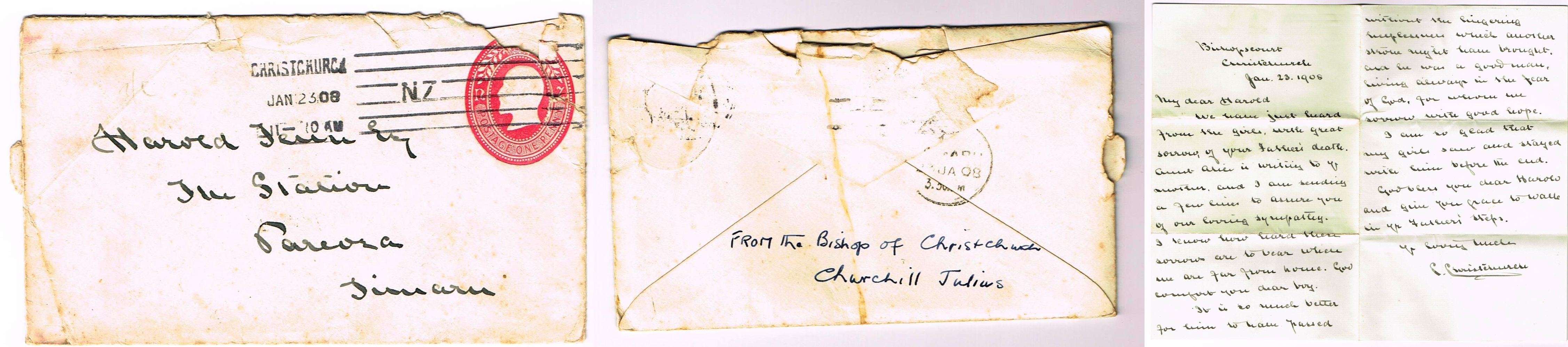 9. Churchill Julius: Letter to H L Fenn on death of his father, 23 Jan 1908, Christchurch. Bishops Court Christchurch NZ Jan 23 1908 My dear Harold We have just heard from the girls with great sorrow of your Father's death. Aunt Alice is writing to your mother and I am sending a few lines to assure you of our loving sympathy. I know how hard these sorrows are to bear when we are far from home. God comfort you dear boy. It is so much better for him to have passed without the lingering helplessness which another stroke might have brought, and he was a good man living always in the fear of God, for whom we sorrow with good Hope. I am so glad that my girls saw and stayed with him before the end. God bless you dear Harold and give you a grace to walk in your Father's steps. Your loving uncle C. Christchurch