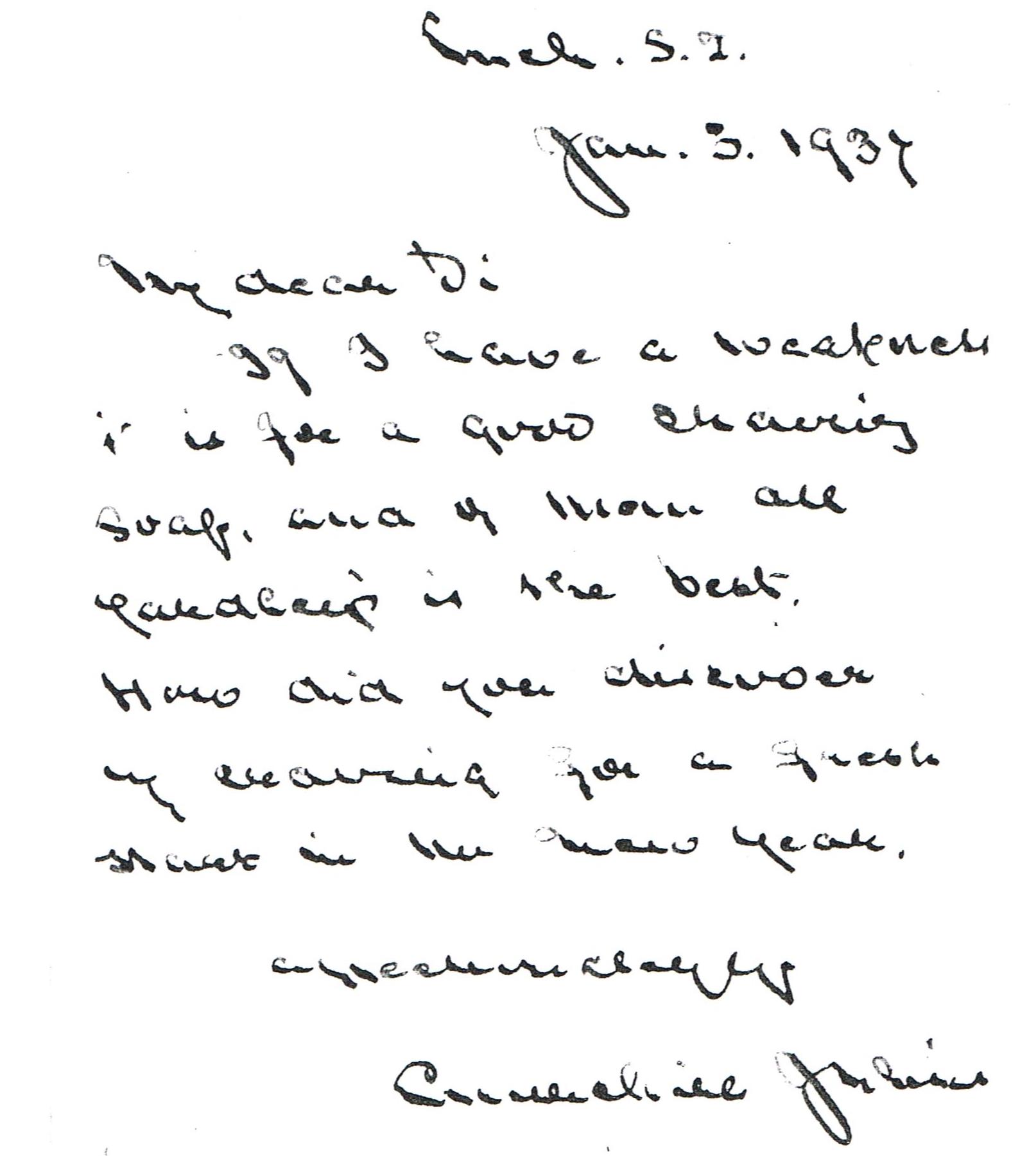 10. Churchill Julius to his Grandaughter Di Wilson: This letter summarises the warmth and humour of the man, 3 Jan 1937, Christchurch. A year before he died Churchill Julius wrote this to his grandaughter, what remarkable handwriting at almost 90 My Dear Di If I have weakness, it is for a good shaving soap, and of them all Yardleys is the best. How did you discover my craving for a great treat in the New Year. Affectionately Churchill Julius