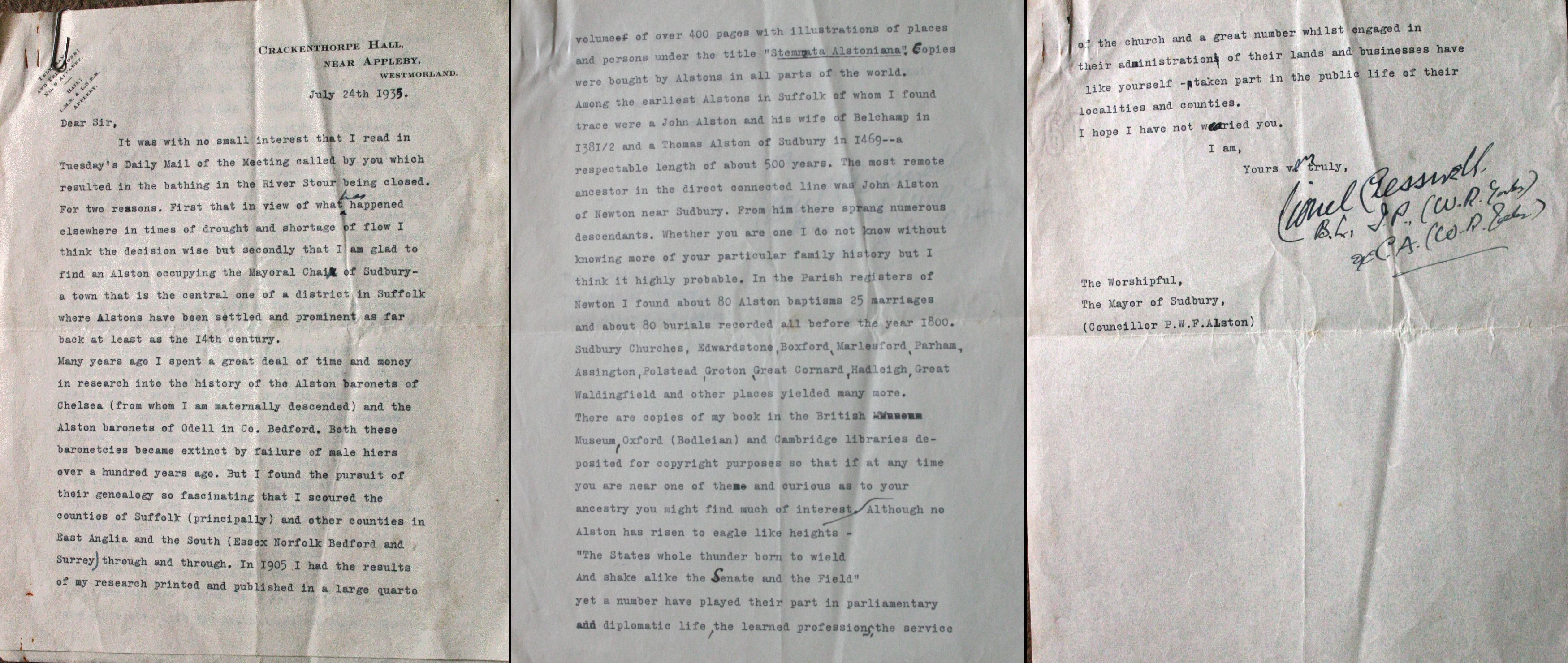 CRACKENTHORPE HALL. NEAR APPLEBY. WESTMORLAND. July 24th 1935. It was with no small interest that I read in Tuesday's Daily Mail of the Meeting called by you which resulted in the bathing in the River Stour being closed. For two reasons. First that in view of what has happened elsewhere in times of drought and shortage of flow I think the decision wise but secondly that I am glad to find an Alston occupying the Mayoral Chair of Sudbury, a town that is the central one of a district in Suffolk where Alstons have been settled and prominent as far back at least as the 14th century. Many years ago I spent a great deal of time and money in research into the history of the Alston baronets of Chelsea (from whom I am maternally descended) and the Alston baronets of Odell in Co. Bedford. Both these baronetcies became extinct by failure of male heirs over a hundred years ago. But I found the pursuit of their genealogy so fascinating that I scoured the counties of Suffolk (principally) and other counties East Anglia and the South (Essex Norfolk Bedford and Surrey) through and through. In 1905 I had the results of my research printed and published in a large quarto volumes of over 400 pages with illustrations of places and persons under the title "Stemmata Alstoniana" Copies were bought by Alstons in all parts of the world. Among the earliest Alstons in Suffolk of whom I trace were a John Alston and his wife of Belchamp of 1381/82 and a Thomas Alston of Sudbury of whom I found in in 1469: respectable length of about 500 years. The most remote ancestor in the direct connected line was John Alston of Newton near Sudbury. From him there sprang numerous descendants. Whether you are one I do not know without knowing more of your particular family history but I think it highly probable. In the Parish registers of Newton I found about 80 Alston baptisms 25 marriages and about 80 burials recorded all before the year 1800. Sudbury Churches, Edwardstone Boxford Marlesford Parham Assington Polstead Groton Great Cornard Hadleigh Great Waldingfield and other places yielded many more. There are copies of my book in the British Museum Oxford (Bodleian) and Cambridge libraries deposited for copyright purposes so that if at any time if you are near one of them and curious as to your ancestry you might find much of interest Although no Alston has risen to eagle like heights: "The States whole thunder born to wield And shake alike the Senate and the Field" yet a number have played their part in parliamentary add diplomatic life the learned profession the service of the church and a great number whilst engaged in their administration of their lands and businesses have like yourself have taken part in the public life of their localities and counties. I hope I have not wearied you. I am, Yours very truly, Lionel Cresswell B.L. J.P. (W.R. Yorks) & C.A. (W.R. Lanks)