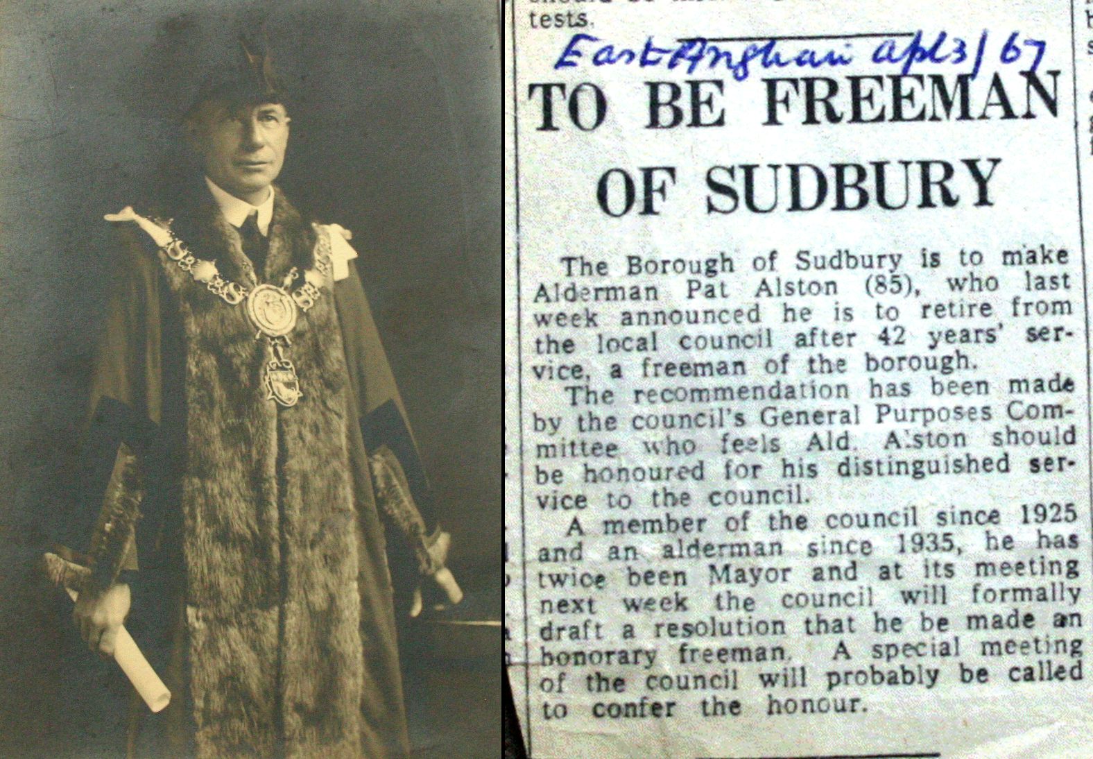 5. Alderman Pat Alston: Made Freeman of Sudbury SFK, 3 Apr 1967. To be Freeman of Sudbury. The Borough of Sudbury is to make Alderman Pat Alston (85), who last week announced he is to retire from the local council after 42 years service, a Freeman of the Borough The recommendation has been made by the Councils General Purposes Committee who feel Alderman Alston should be honoured for his distinguished service to the council. A member of the Council since 1925 and an Alderman since 1935 he has twice been Mayor and at its meeting next week the Council will formally draft a resolution that he be made an Honorary Freeman. A special meeting of the Council will probably be called to confer the honour. East Anglian 3 April 1967.