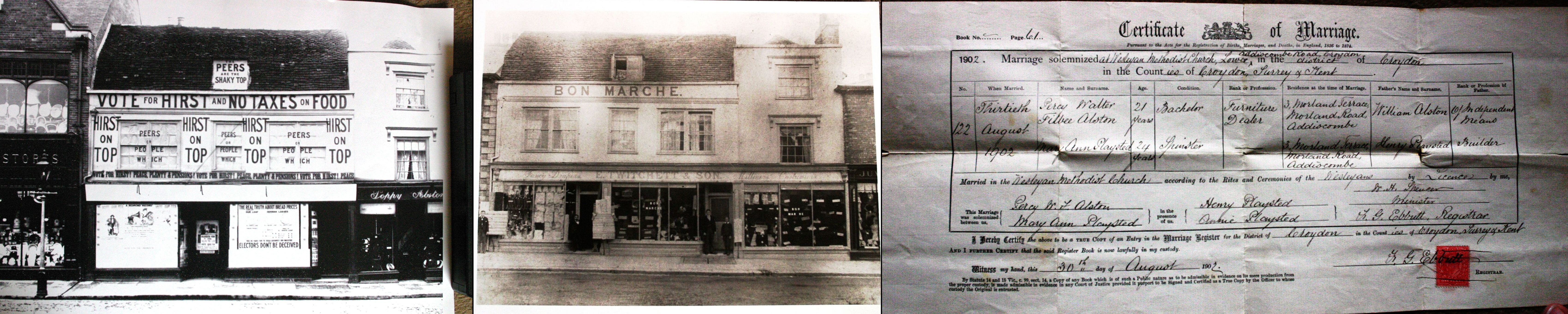 1. Mary Ann (Poppy) Playstead. Poppy's business premises Old Market Place Sudbury (smaller shop to right), her marriage certificate 1902.