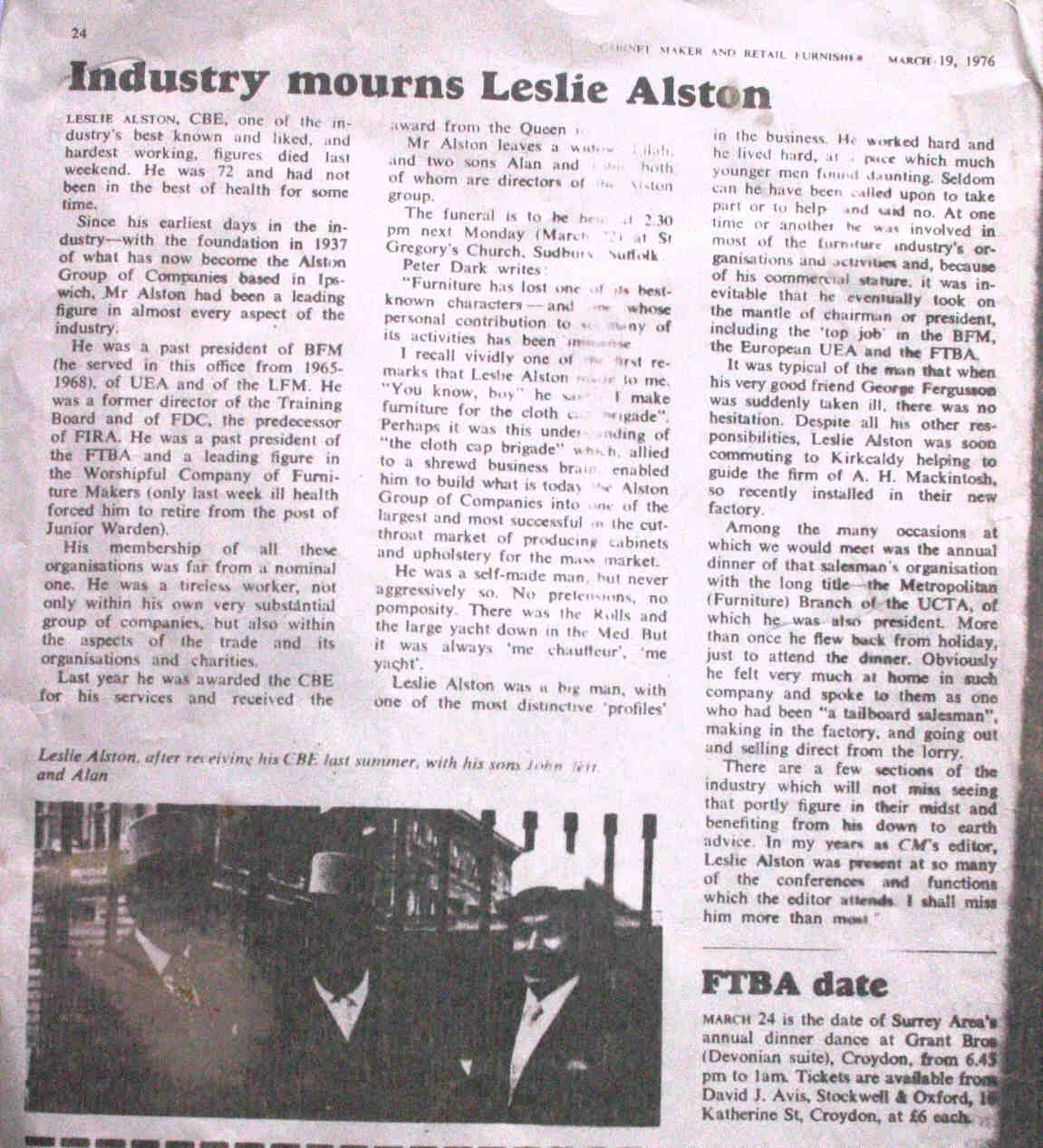 Obituary. Industry Mourns Leslie Alston. Leslie Alston, CBE, one of the industry's best known and liked, and hardest working figures, died last weekend. He was 72 and had not been in the best of health for some time. Since his earliest days in the industry, with the foundation in 1937 of what has now become the Alston Group of Companies based in Ipswich, Mr Alston has been a leading figure in almost every aspect of the industry. He was a past president of BFM (he served in this office from 1965 - 1968), of UEA and of the LFM. He was a former director of the Training Board and of FDC, the predecessor of the FIRA. He was a past president of the FTBA and a leading figure in the Worshipful Company of Furniture Makers (only last week ill-health forced him to retire from the post of Junior Warden). His membership of all these organisations was far from a nominal one he was a tireless worker, not only within his own very substantial group of companies, but also within the aspects of the trade and its organisation and charities. Last year he was awarded the CBE for his services and received the award from the Queen herself. Mr Alston leaves a widow Eliza and two sons Alan and Rex both of whom are directors of the Alston Group. The funeral is to be held at 2:30 pm next Monday (March 22nd at St Gregory's Church Sudbury, Suffolk). Peter Dark writes: "Furniture has lost one of its best-known characters and one whose personal contribution to so many of its activities has been immense. I recall vividly one of the first remarks that Leslie Alston made to me. "You know, boy" he said "I make furniture for the cloth cap brigade" perhaps it was this understanding of "the cloth cap brigade" which allied to a shrewd business brain enabled him to build what is today the Alston Group of companies into one of the largest and most successful in the cutthroat market of producing cabinets and upholstery for the mass market He was a self-made man, but never aggressively so. No pretensions, no pomposity. There was the Rolls and the large yacht down in the Med. But it was always "me chauffeur", "me yacht". Leslie Alston was a big man, with one of the most distinctive profiles in the business he worked hard and he lived hard, at a pace which much younger men found daunting. Seldom can he have been called upon to take part or to help and said no. At one time or another he was involved in most of the furniture industries organisations and activities and, because of his commercial stature, it was inevitable that he eventually took on the mantle of chairman or president, including the "top job" in the BFM, the European UEA and the FTBA. It was typical of the man that when his very good friend George Ferguson was suddenly taken ill, there was no hesitation despite all his other responsibilities, Leslie Alston was soon commuting to Kirkcaldy helping to guide the firm of A H Mackintosh, so recently installed in their new factory. Among the many occasions at which we would meet was the annual dinner of that salesman's organisation with the long title: the Metropolitan (Furniture) branch of the UCTA, of which he was also president More than once he flew back from holiday, just to attend the dinner. Obviously he felt very much at home in such company and spoke to them as one who had been "a tail board salesman", making in the factory, and going out and selling direct from the lorry. There are a few sections of the industry which will not miss seeing that portly figure in their midst and benefiting from his down-to-earth advice. In my years as CM's editor, Leslie Alston was present at so many of the conferences and functions which the editor attends I shall miss him more than most. Ref: Cabinetmaker and Retail Furnisher March 19, 1976