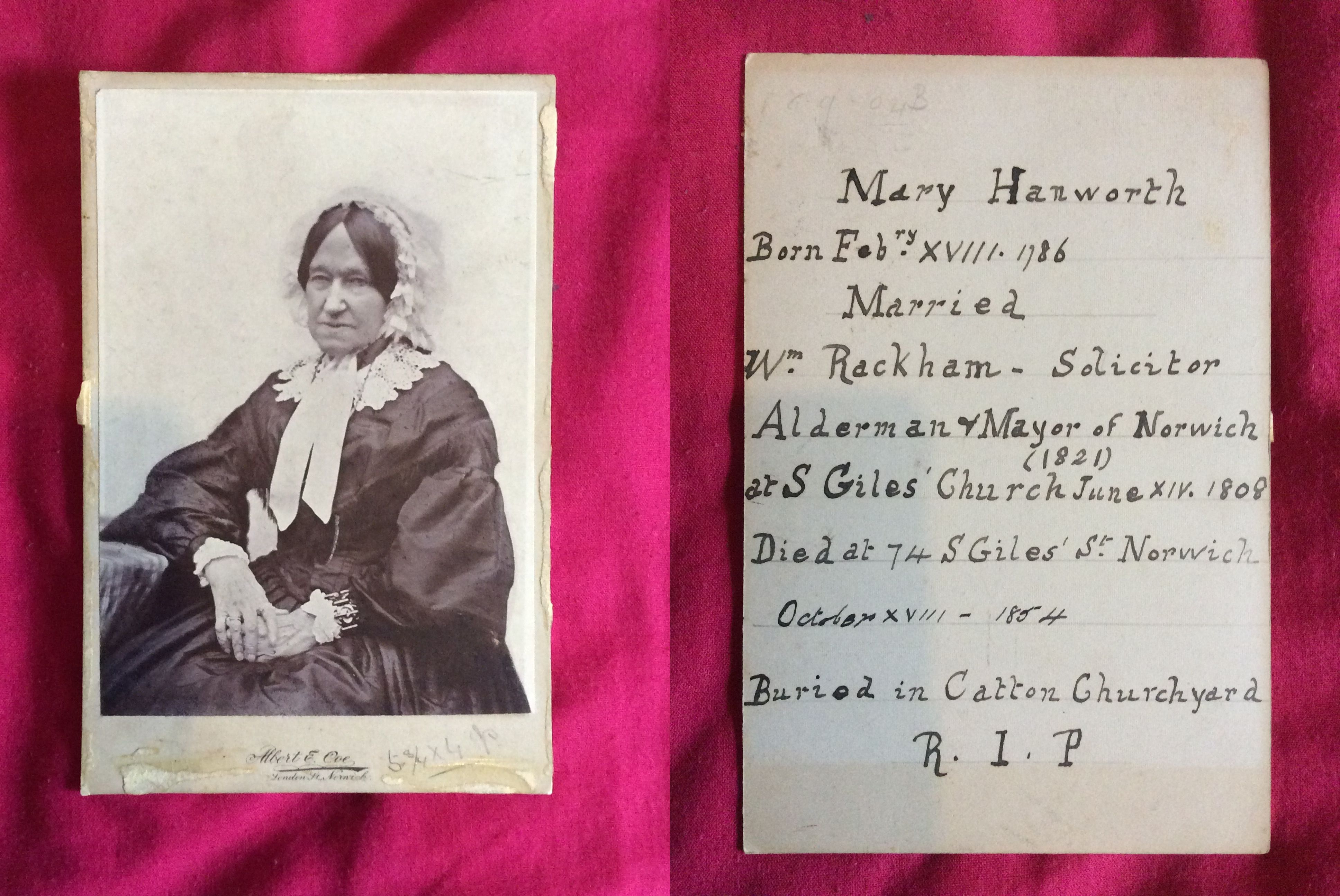 Mary married Alderman William RACKHAM JP [3867] [MRIN: 1330], son of Thomas RACKHAM [28573] and Elizabeth DUNNITT [28574], on 14 Jun 1808 in St Giles Norwich. (Alderman William RACKHAM JP [3867] was born on 17 Mar 1782 in Norwich NFK, baptised on 20 Mar 1782 in St Margaret Norwich, died on 18 Oct 1854 in Great Yarmouth NFK and was buried on 26 Oct 1854 in St Giles Norwich.) |