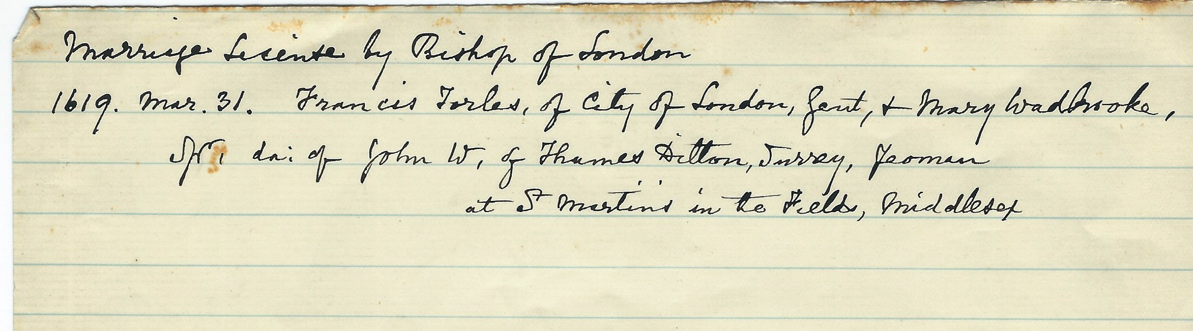 Francis married Mary WADBROOKE [7122] [MRIN: 2368], daughter of John WADBROOKE of Thames Ditton [7123] and Unknown, on 31 Mar 1619 in St Martins in the Fields. |