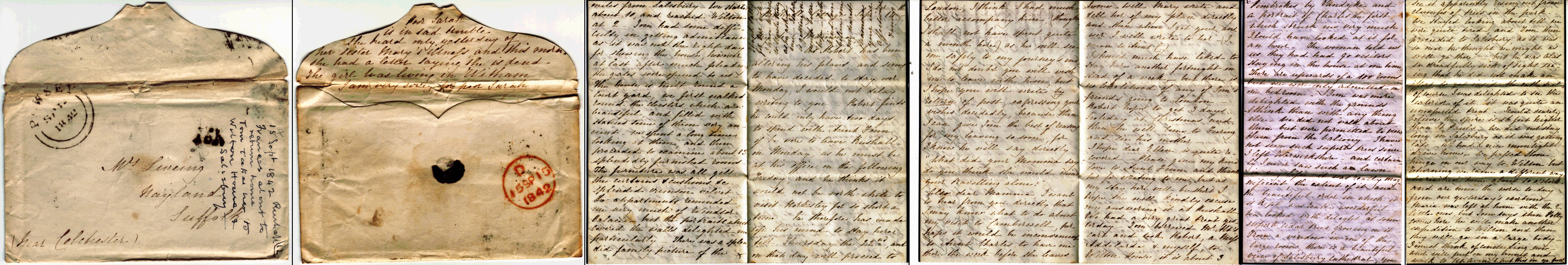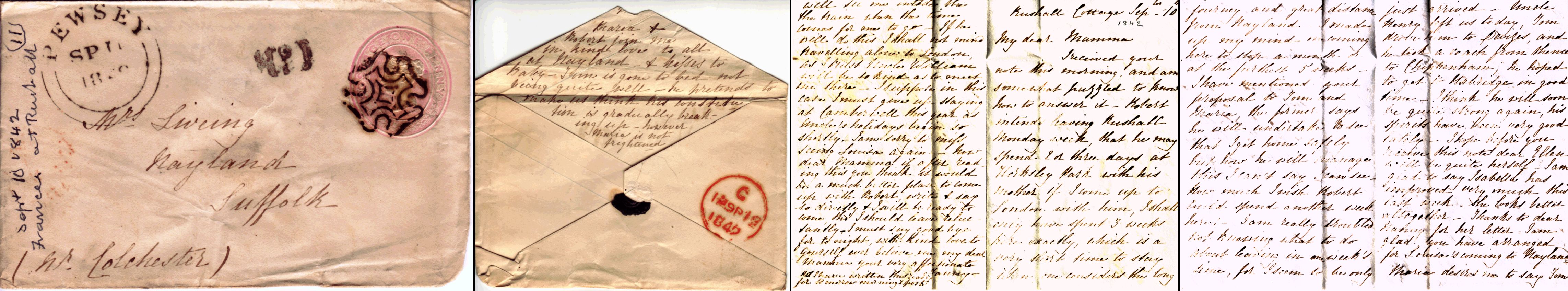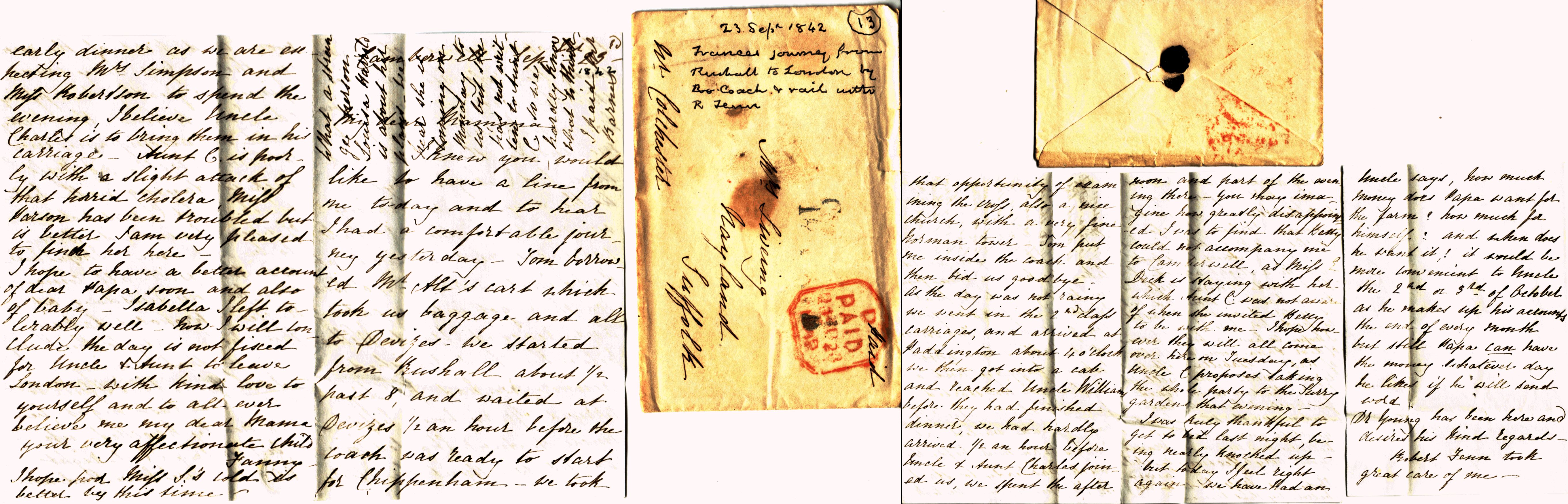 12. Frances (Fanny) Liveing: Letter to her mother, 23 Sep 1842, Rushall WIL. Mrs Liveing Nayland Suffolk (Nr Colchester) Camberwell September 23 My dear Mamma I know you would like to have a line from me today and to hear I had a comfortable journey yesterday - Tom borrowed Mr Alf's cart which took us baggage and all to Devizes - We started from Rushall about half past 8 and waited at Devizes half an hour before the coach was ready to start for Chippenham - We took that opportunity of examining the crofs also a nice church, with a very fine Norman tower - Tom put me inside the coach and then bid us goodbye. As the day was not rainy we went in the second clafs carriages and arrived at Paddington about four o'clock. We then got into a cab and reached Uncle William before they had finished dinner, we had hardly arrived half an hour before Uncle and Aunt Charles joined us we spent the afternoon and part of the evening there - you may imagine how greatly disappointed I was to find that Betty could not accompany me to Camberwell as Miss E. Deck is staying with her which Aunt C was not aware of when she invited Betty to be with me - I hope however they will all come over here on Tuesday as Uncle C proposes taking the whole party to the Surrey Gardens that evening. I was truly thankful to get to bed last night being nearly knocked up - but today I feel right again - we have had an early dinner as we are expecting Mrs Simpson and Mifs Robertson to spend the evening, I believe Uncle Charles is to bring them in his carriage - Aunt C is poorly with a slight attack of that horrid cholera, Mifs Parson has been troubled but is better I am very pleased to find her here - I hope to have a better account of dear Papa soon and also a baby - Isabella I left tolerably well - now I will conclude, the day is not fixed for Uncle and Aunt to leave London - with kind love to yourself and to all ever believe me my dear Mamma your very affectionate child Fanny I hope poor Mifs S's cold is better by this time - Uncle says, how much money does Papa want for the farm? how much for himself? and when does he want it? It would be more convenient to Uncle the second or third of October as he makes up his accounts the end of every month but still Papa can have the money whatever day he likes if he will send word. Dr Young has been here and desires his kind regards - Robert Fenn took great care of me - What a strange person Louisa Harold is about her plans - We hear she is coming on Monday to us but she has not written to Aunt C so we hardly know what to think I paid Mr Barnes. Written on four sides of a small note sheet plus an inserted sheet and overwriting on the front page. Envelope shows postmark with date and note paid, also unsigned note "23 September 1842 Frances journey from Rushall to London by coach and rail with R Fenn". Sealed with a black seal. Original in Fenn archive.