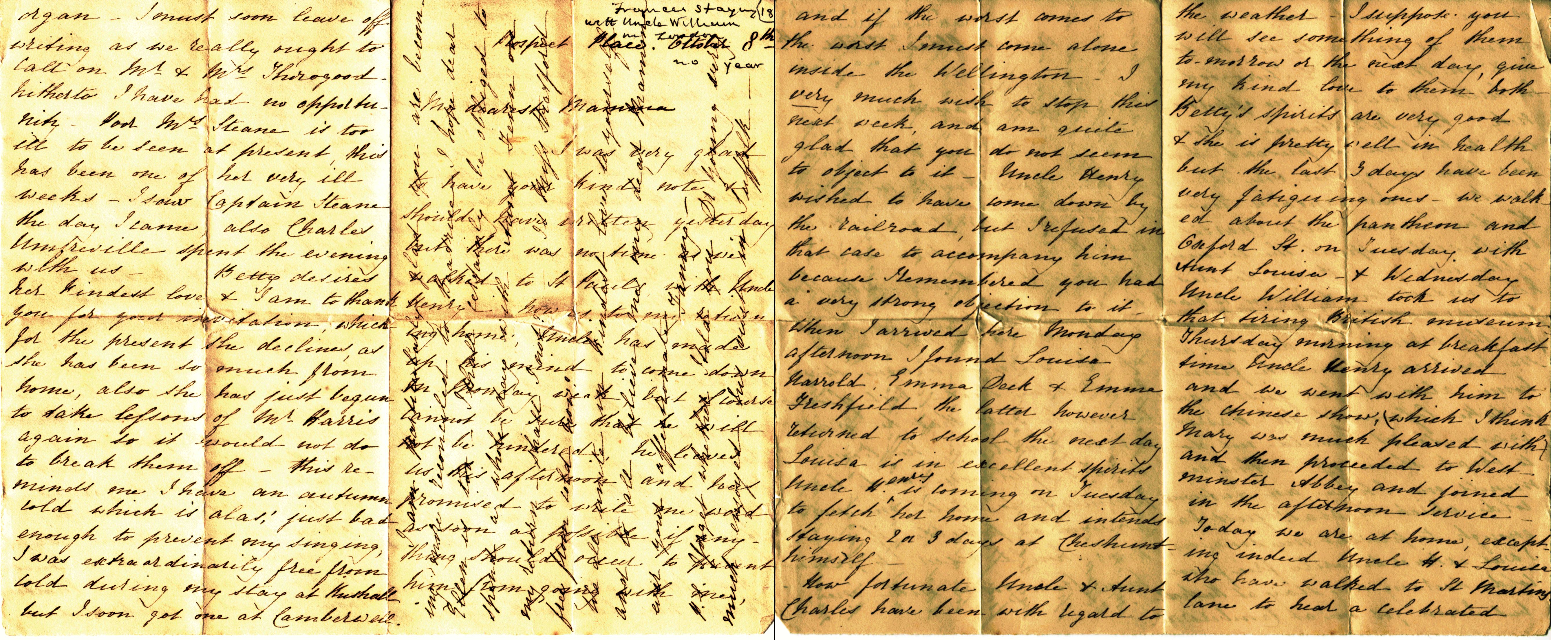 13. Frances (Fanny) Liveing: Letter to her mother, 8 Oct 1842, London. Prospect Place October 8th My dearest Mamma I was very glad to have your kind note and should have written yesterday but there was no time as we walked to St Paul's with uncle Henry. Now as to my returning home Uncle has made up his mind to come down on Monday week but of course cannot be sure that he will not be hindered, he leaves us this afternoon and has promised to write to me word as soon as pofsible if anything short occur to prevent him from going with me, and if the worst comes to the worst I must come alone inside the Wellington - I very much wish to stop this next week and am quite glad that you do not seem to object to it - Uncle Henry wished to have come down by the railroad, but I refused in that case to accompany him because I remembered you had a very strong objection to it. When I arrived here on Monday afternoon I found Louisa Harold, Emma Deck & Emma Freshfield, the latter however returned to school the next day. Louise is in excellent spirits Uncle Henry is coming on Tuesday to fetch her home and intends staying 2 or 3 days at Cheshunt himself. How fortunate Uncle and Aunt Charles have been with regard to the weather - I suppose you will see something of them tomorrow or the next day, give my kind love to them both Betty's spirits are very good and she is pretty well in health but the last 3 days have been very fatiguing ones - we walked about the Pantheon and Oxford Street on Tuesday with Aunt Louisa and Wednesday Uncle William took us to that tiring British Museum. Thursday morning at breakfast time Uncle Henry arrived and we went with him to the Chinese show (which I think Mary was much pleased with) and then proceeded to Westminster's Abbey and joined in the afternoon service - Today we are at home excepting indeed Uncle H. & Louise who have walked to St Martin's Lane to hear a celebrated organ - I must soon leave off writing as we really ought to call on Mr and Mrs Thorogood hitherto I have had no opportunity - Poor Mrs Steane is too ill to be seen at present, this has been one of her very ill weeks - I saw Captain Steane the day I came, also Charles Mrs Neville (?) spent the evening with as - Betty desires her kindest love and I am to thank you for your invitation which for the present she declines as she has been so much from home, also she has just begun to take lessons of Mr Harris again so it would not do to break them off - this reminds me I have an autumn cold which is a alas just bad enough to prevent my singing, I was extra ordinarily free from cold during my stay at Rushall but I soon got one at Camberwell. I am particularly glad you are becoming more reconciled to Beatrice I hope dear Ellen is to - I shall certainly be obliged to spend a whole day with Aunt Fenn on my return - shall I not? Is Mifs Stratford free from cold now?. We all unite in kindest love to yourself and to all believe me my dear Mamma ever your affectionate. Fanny PS I forgot whether I told you Dr Young very much enjoyed his visit in Suffolk Written on four sides of a notepaper one side over written, not addressed and not dated with the year but from the references to Rushall and Camberwell the transcriber (ELF) would guess at 1842. An unsigned note reads "Frances staying with Uncle William in London no year" Original in Fenn archive.