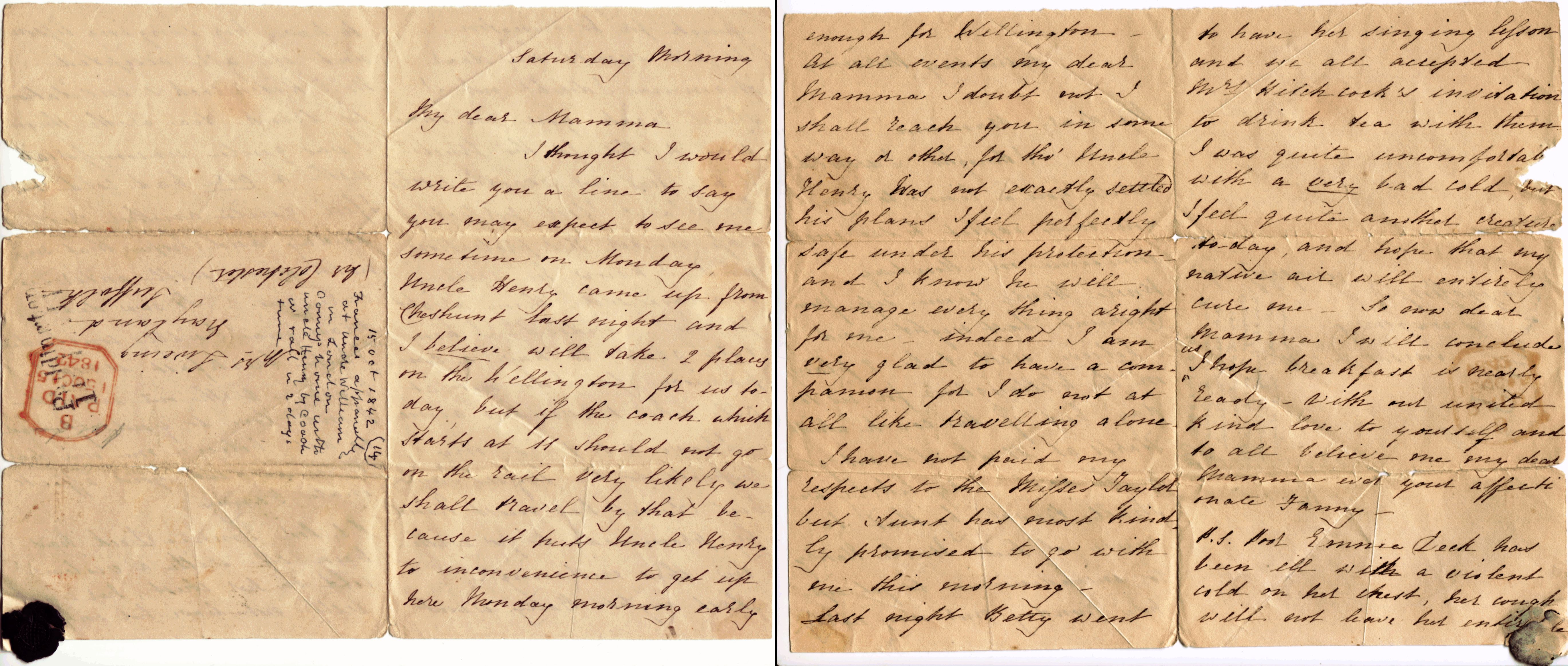 14. Frances (Fanny) Liveing: Letter to her mother, 15 Oct 1842, London. Mrs Liveing Nayland Suffolk (Nr Colchester) Saturday morning My dear Mamma I thought I would write you a line to say you may expect to see me sometime on Monday. Uncle Henry came up from Cheshunt last night and I believe will take two places on the Wellington for us today, but if the coach which starts at 11 should not go on the rail very likely we shall travel by that because it puts Uncle Henry to inconvenience to get up here Monday morning early enough for Wellington - At all events my dear Mamma I doubt not I shall reach you in some way or other, for tho Uncle Henry has not exactly settled his plan plans I feel perfectly safe under his protection and I know he will manage everything all right for me - indeed I am very glad to have a companion for I do not at all like travelling alone. I have not paid my respects to them Mifses Taylor but Aunt has most kindly promised to go with me this morning - Last night Betty went to have her singing lefson and we all accepted Mrs Hitchcock's invitation to drink tea with them. I was quite uncomfortable with a very bad cold, but I feel quite another creature today, and hope that my native wit will entirely cure me - So now dear Mamma I will conclude us I hope breakfast is nearly ready - With our united kind love to yourself and to all believe me my dear Mamma ever your affectionate Fanny P.S. Poor Emma Deck has been ill with a violent cold on her chest her cough will not leave her entirely. Written on three sides of a notepaper sealed with black sealing wax, postmarked clearly "B paid 15Oct15 1842" over stamped "Paddington . . . . . " with an unsigned note "15 October 1842 Frances apparently an Uncle William in London coming home with Uncle Henry by coach or rail in two days time" Original in Fenn archive