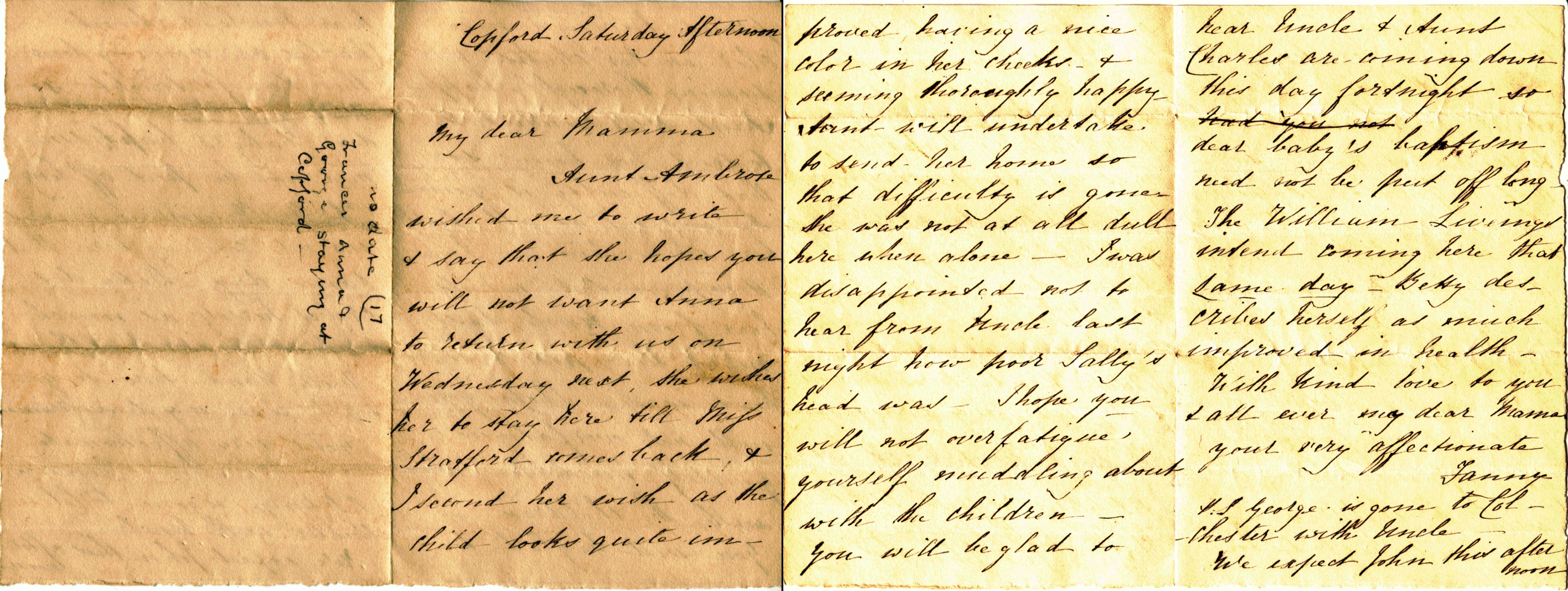15. Frances (Fanny) Liveing: Letter to her mother, After Oct 1842, Copford ESS. Copford Saturday Afternoon My dear Mamma Aunt Ambrose wished me to write and say that she hopes you will not want Anna to return with us on Wednesday next, she wishes her to stay here till Mifs Stratford comes back, and I second her wish as the child looks quite improved, having a nice colour in her cheeks & seeming thoroughly happy Aunt will undertake to send her home so that difficulty is gone. She was not at all dull here when alone - I was disappointed not to hear from Uncle last night how poor Sally's head was - I hope you will not over fatigue yourself muddling about with the children - you will be glad to hear Uncle and Aunt Charles are coming down this day fortnight so dear baby's baptism need not be put off long. The William Liveings intend coming here that same day - Betty describes herself as much improved in health. With kind love to you and all ever my dear Mamma your very affectionate Fanny PS George is gone to Colchester with uncle - We expect John this afternoon. Written on three sides of a small note sheet, unaddressed & undated, with an unsigned note "no date Frances Anne and George staying at Copford" Original in Fenn archive.