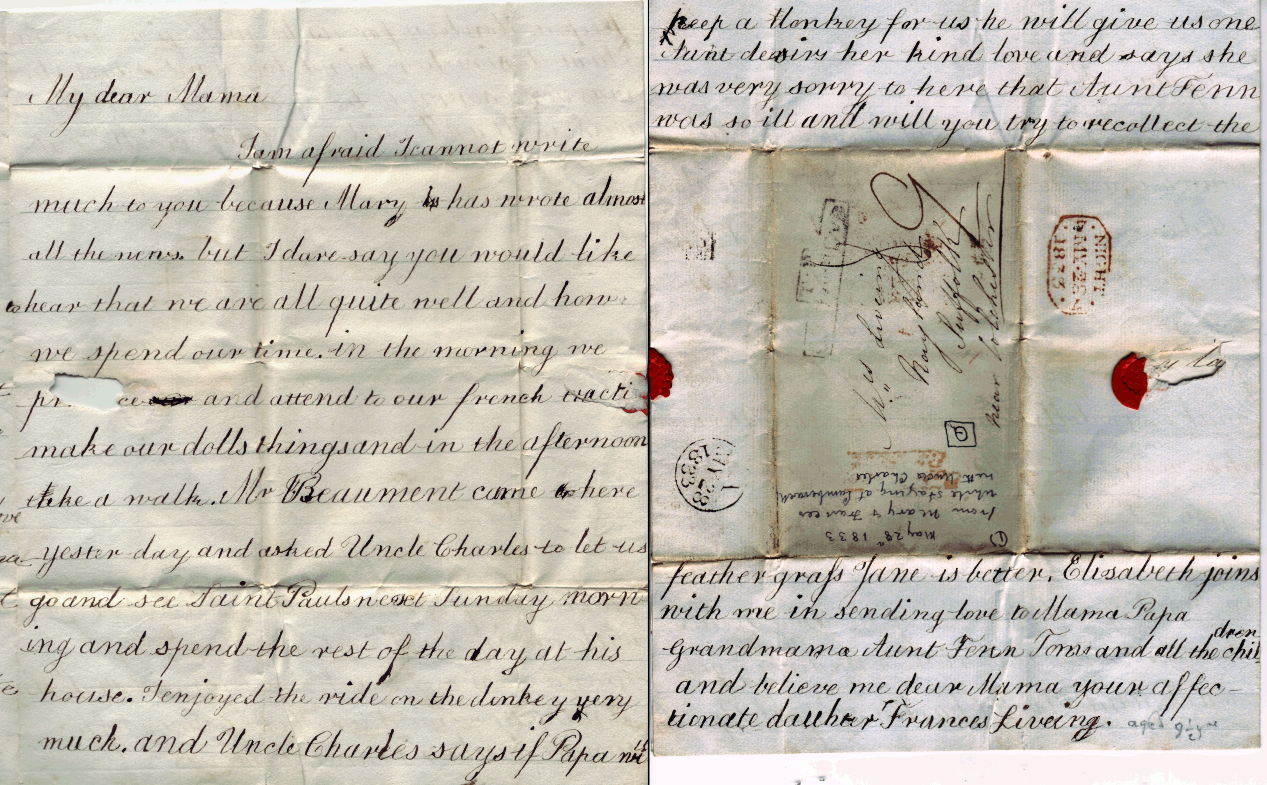 1. Frances (Fanny) Liveing: Letter to her mother, 28 May 1833, Camberwell LND. Mrs Liveing Nayland Suffolk Near Colchester Camberwell May 28th My dear Mama I am afraid I cannot write much to you because Mary has wrote almost all the news that idea say you would like to hear that we are all quite well and how we spend our time in the morning we practice and attend to our French then make our dolls things and in the afternoon and take a walk. Mr Beaumont came here yesterday and asked uncle Charles to let us go and see St Paul's next Sunday morning and spent the rest of the day at his house. I enjoyed the ride on the donkey very much and Uncle Charles says if Papa we will keep a donkey for us he will give us one. Aunt desires her kind love and says that she was very sorry to hear that aunt Fenn was so ill and will try to recollect that feather grafs Jane is better, Elizabeth joins with me in sending love to Mamma Papa Grandmamma Aunt Fenn Tom and all the children and believe me dear Mamma your affectionate daughter Frances Liveing Written on four sides of one sheet with clear postmarks Night MY 28 1833, with an unsigned note "from Mary and Frances was staying at Camberwell with Uncle Charles" folded inserted and sealed. This letter was shared with Mary Kate Liveing Original in Fenn archive 2007