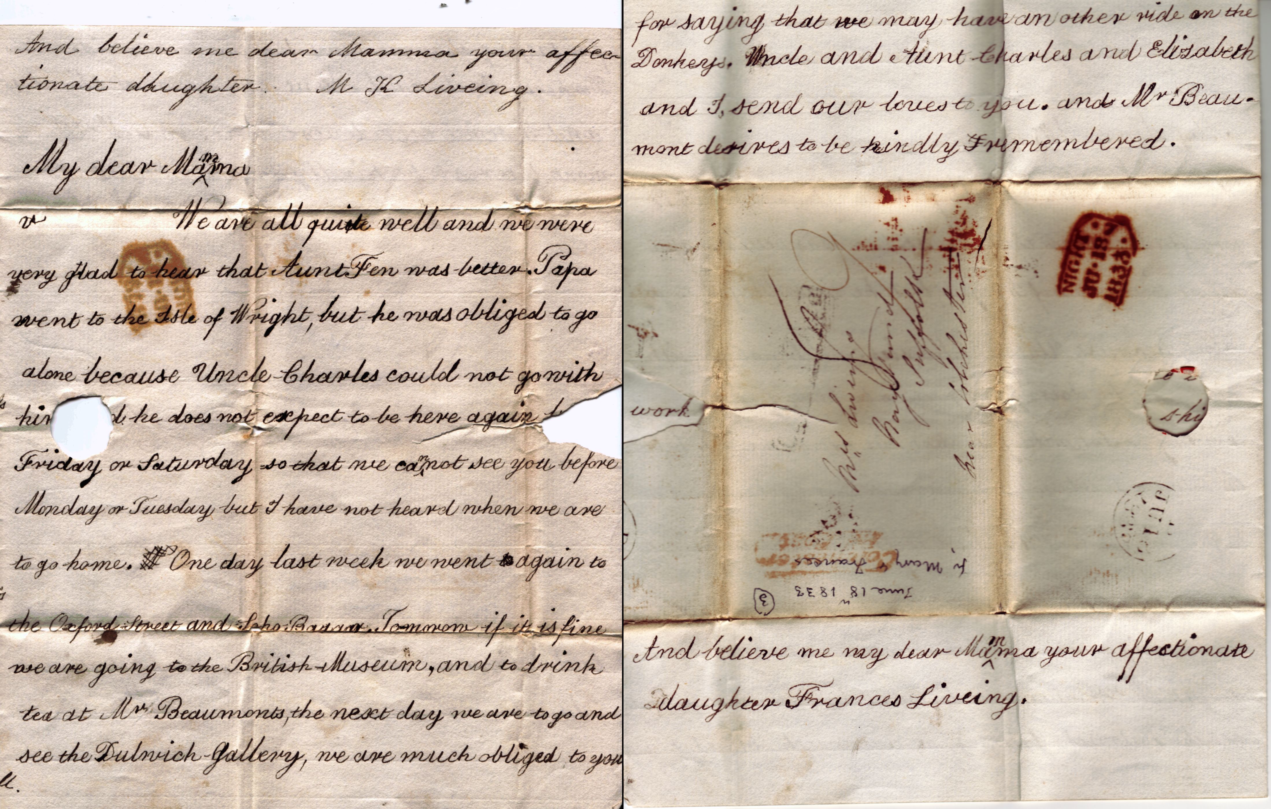 3. Frances (Fanny) Liveing: Letter to her mother, 18 Jun 1833, Camberwell LND. Mrs Liveing Nayland Suffolk near Colchester My dear Mamma We are all quite well and we were very glad to hear that Aunt Fen was better. Papa went to the Isle of Wright (sic) but he was obliged to go alone because Uncle Charles could not go with him and he does not expect to be here again till Friday or Saturday so that we cannot see you before Monday or Tuesday but I have not heard when we are to go home. One day last week we went again to the Oxford Street and Soho bazaar. Tomorrow if it is fine we are going to the British Museum, and to drink tea at Mr Beaumonts, the next day we are to go and see the Dulwich Gallery, we are much obliged to you for saying that we may have another ride on the donkeys. Uncle and Aunt Charles and Elizabeth and I send our loves to you and Mr Beaumont desires to be kindly remembered. and believe me my dear Mamma your affectionate daughter Frances Liveing Letter written on 3 1/2 sides of a sheet postmarked " night J U 18 1833" folded inserted and sealed. Note "June 18 1833 fr Mary and Frances" Original in Fenn archive