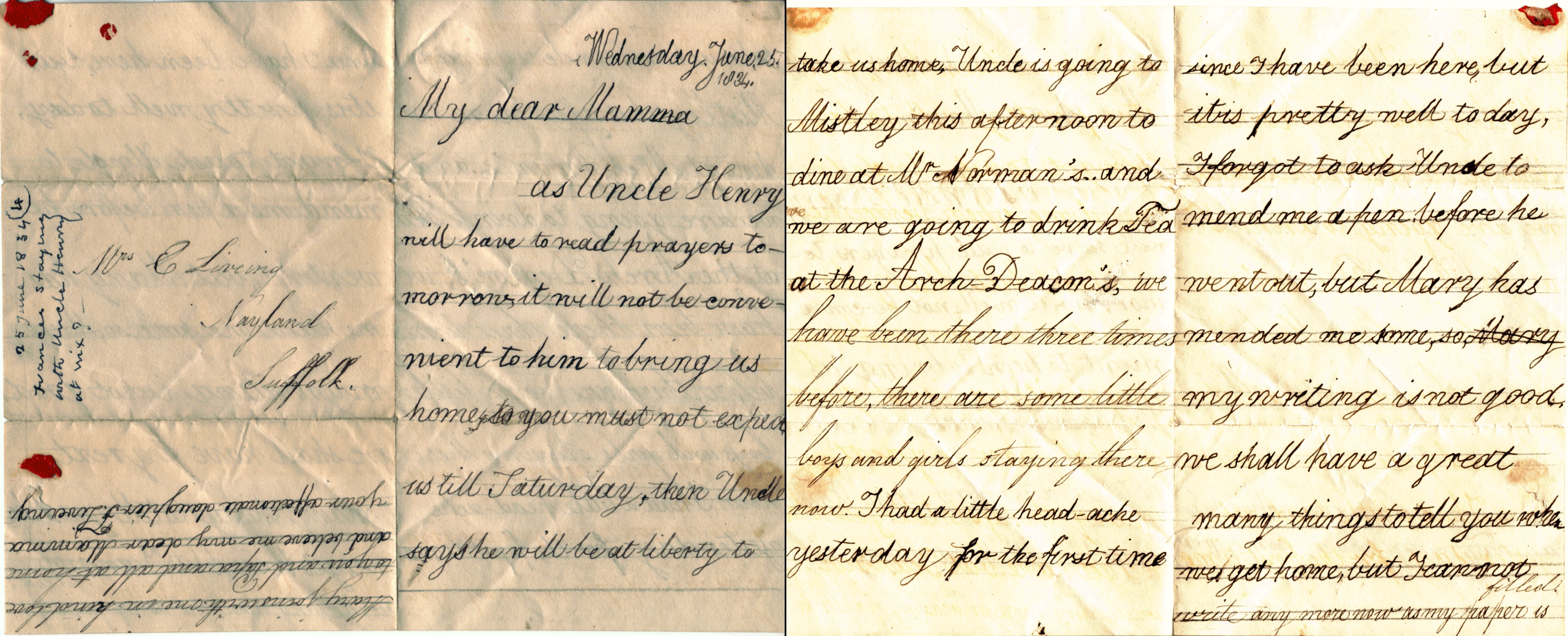 4. Frances (Fanny) Liveing: Letter to her mother, 25 Jun 1834, Wix ESS. Mrs E. Liveing Nayland Suffolk Wednesday, June 25, 1834 My dear Mamma As Uncle Henry will have to read prayers tomorrow, it will not be convenient to him to bring us home so you must not expect us till Saturday, then Uncle says he will be at liberty to take us home, Uncle is going to Mistley this afternoon to dine at Mr Norman's and we're going to drink tea at the Arch-Deacon's, we have been there three times before there are some little boys and girls staying there now. I had a little headache yesterday for the first time since I have been here, but it's pretty well today, I forgot to ask Uncle to mend me a pen before he went out, but Mary has mended me some, so my writing is not good we shall have a great many things to tell you when we get home but I cannot write any more now as my paper is filled Mary joins with me in kind love to you and Papa and all at home and believe me my dear Mamma your affectionate daughter F. Liveing Written on four sides of a small note paper folded and sealed, with an unsigned note reading "25 June 1834 Frances staying with Uncle Henry at Wix?" Origional in Fenn archive 2007