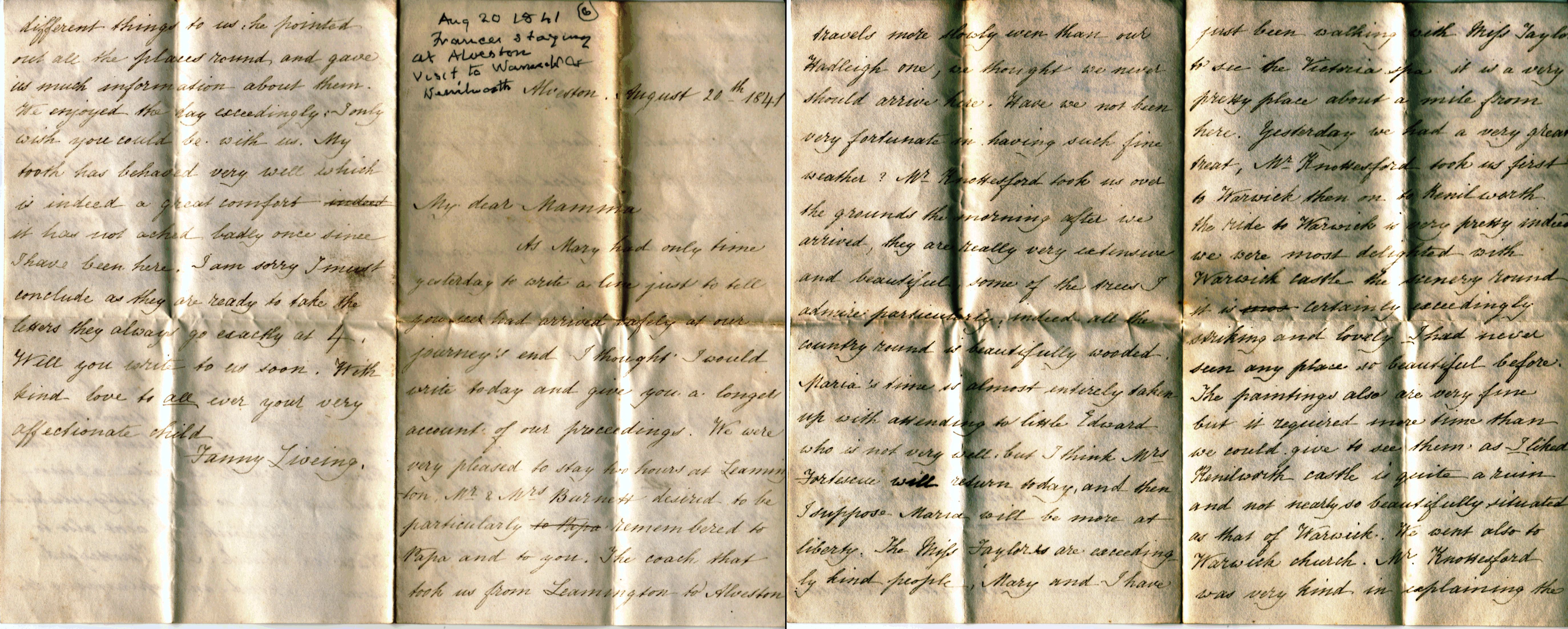 6. Frances (Fanny) Liveing: Letter to her mother, 20 Aug 1841, Alveston WAR. Alveston August 20, 1841 My dear Mamma As Mary had only time yesterday to write a line just to tell you we had arrived safely at our journey's end I thought I would write today and give you a longer account of our proceedings. We were very pleased to stay two hours at Leamington Mr and Mrs Burnett desired to be particularly remembered to Papa and to you. The coach that took us from Leamington to Alveston travels more slowly even than our Headley one, we thought we never should arrive here. Have we not been very fortunate in having such a fine weather? Mr Knottisford took us over the grounds the morning after we arrived, they are really very extensive and beautiful, some of the trees I admire particularly, indeed all the country round is beautifully wooded. Maria's time is almost entirely taken up with attending to little Edward who is not very well but I think Mrs Fortescue will return today, and then I suppose Maria will be more at liberty. The Mifs Taylors are exceedingly kind people Mary and I have just been walking with Mifs Taylor to see the Victoria spa it is a very pretty place about a mile from here. Yesterday we had a very great treat, Mr Knottisford took us first to Warwick then on to Kenilworth the ride to Warwick is very pretty indeed we were most delighted with Warwick Castle the scenery round it is certainly exceedingly striking and lovely. I had never seen any place so beautiful before. The paintings also are very fine but it required more time than we could give to see them as I liked Kenilworth Castle is quite a ruin and not nearly so beautifully situated as that of Warwick. We went also to Warwick Church Mr Knottesford was very kind in explaining the different things to us, he pointed out all the places round and gave us much information about them. We enjoyed the day exceedingly: I only wish you could be with us. My tooth has behaved very well which is indeed a great comfort it has not ached badly once since I have been here. I am sorry I must conclude as they are ready to take the letters they always go exactly at 4. Will you write to us soon. With kind love to all ever your very affectionate child Fanny Liveing Written on four sides of a small sheet with an unsigned note reading "Aug 20 1841 Frances staying at Alveston visit to Warwick and Kenilworth" Unaddressed so it was presumably enclosed with other mail. Original in Fenn archive