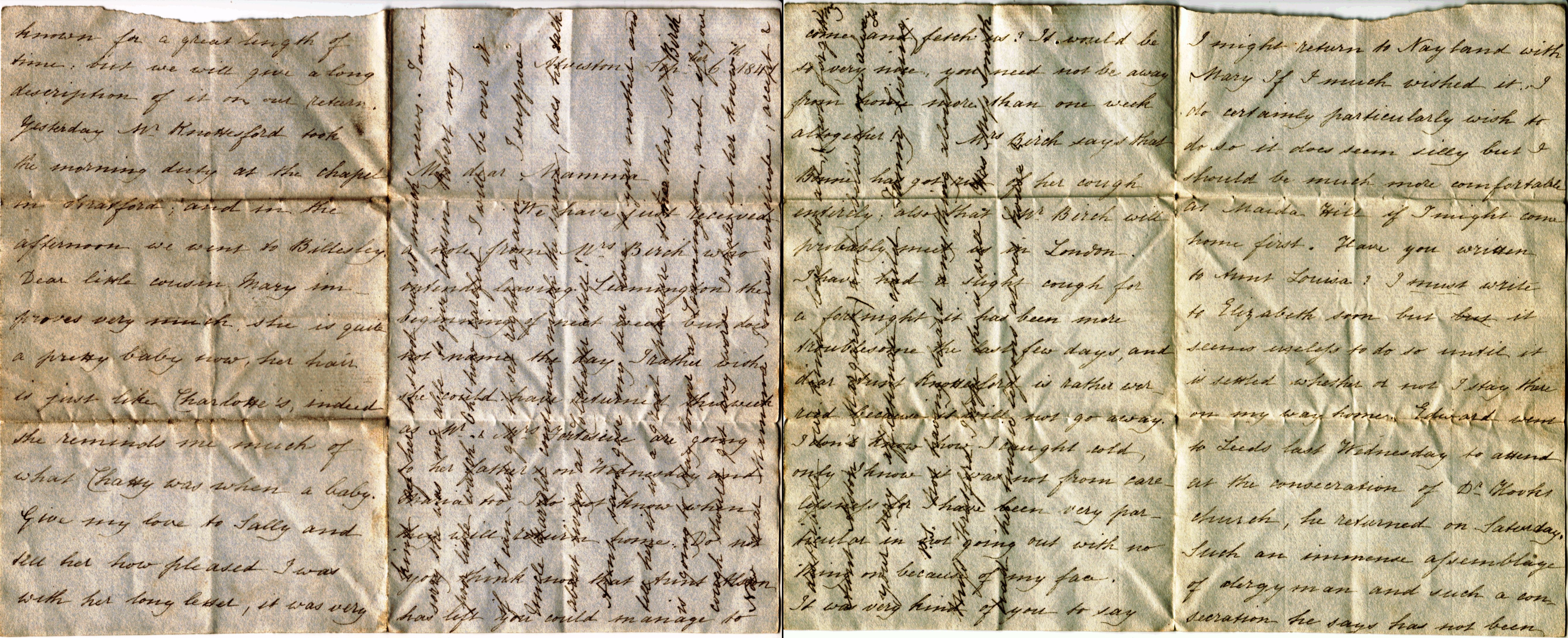 7. Frances (Fanny) Liveing: Letter to her mother, 6 Sep 1841, Alveston WAR. Alveston September 6, 1841 My dear Mamma We have just received a note from Mrs Birch who intends leaving Leamington the beginning of next week but does not name the day. I rather wish she could have returned this week as Mr and Mrs Fortescue are going to her fathers on Wednesday and Maria too, I do not know when they will return home. Do not you think now that Aunt Alston has left you could manage to come and fetch us? It would be so very nice, you need not be away from home more than one week altogether! Mrs Birch says that Bonne has got rid of her cough entirely, also that Mrs Birch will probably meet us in London. I have had a slight cough for a fortnight it has been more troublesome the last few days and dear Aunt Knottesford is rather worried because it will not go away. I don't know how I caught cold, only I know it was not from carelefsnefs for I have been very particular is not going out with nothing on because of my face. It was very kind of you to say I might return to Nayland with Mary if I much wished it I do certainly particularly wish to do so it does seem silly but I should be much more comfortable at Maida Hill if I might come home first. Have you written to aunt Louisa? I must write to Elizabeth soon but it seems uselefs to do so until it is settled whether or not I stay there on my way home. Edward went to Leeds last Wednesday to attend at the consecration of Dr Hook's church, he returned on Saturday. Such an immense afsemblage of clergyman and such a consecration he says has not been known for a great length of time; but we will give a long description of it on our return. Yesterday Mr Knottesford took the morning duty at the chapel in in Stratford; and in the afternoon we went to Billesley. Dear little cousin Mary improves very much, she is quite a pretty baby now, her hair is just like Charlotte's, indeed she reminds me much of what Chatty was when a baby. Give my love to Sally and tell her how pleased I was with her long letter, it was very kind of her to send us so much news. I am sorry she was not able to give Cousin Robert my poor little watch. Oh how careful I will be over it if I can but get it set right again. I suppose Uncle Harold continues much the same, does he talk about living at Colchester still? Aren't Sears give my dear love to your mother and tell her it is a great pleasure to her that Mrs Birch is going to stay longer at Leamington and if you're cough should get any worse I shall let her know. Now dear Mamma I must conclude accept and distribute our kind love to all, not forgetting aunt Alston & Margaret and believe me always your very affectionate child Fanny Liveing PS Not having heard anything about Mifs Stratford I hope she is well. Mifs Smith had her music lessons at our house. Written on four sides of a note sheet, and over written on two. No envelope. Original in Fenn archive.