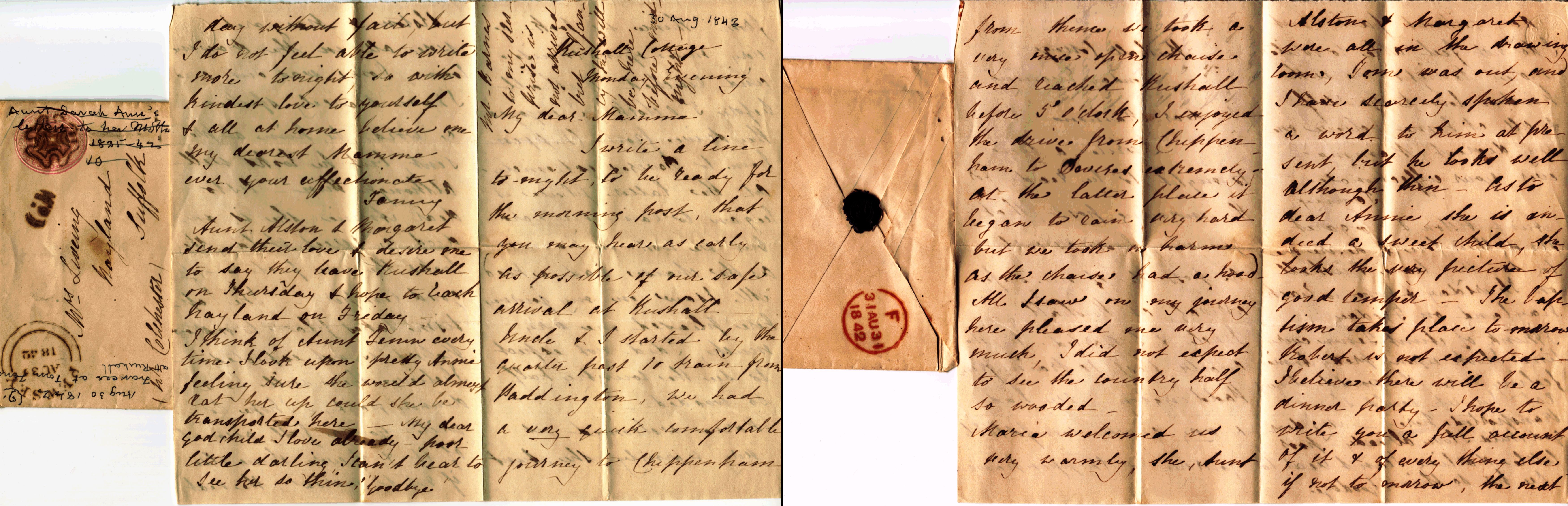 8. Frances (Fanny) Liveing: Letter to her mother, 29 Aug 1842, Rushall WIL. Mrs Liveing Nayland Suffolk Nr Colchester Rushall Cottage Monday evening My dear Mamma I write a line tonight to be ready for the morning Post that you may hear as early as possible of our safe arrival at Rushall - Uncle and I started by the quarter past 10 train from Paddington, we had a very quick comfortable journey to Chippenham from thence we took a very nice open chaise and reached Rushall before five o'clock, I enjoyed the drive from Chippenham to Devizes extremely - at the latter place it began to rain very hard but we took no harm as the chaise had a hood. All I saw on my journey here pleased me very much, I did not expect to see the country half so wooded. Maria welcomed us very warmly, she, Aunt Alston and Margaret were all in the drawing-room, Tom was out and I have scarcely spoken a word to him at present but he looks well although thin - As to dear Annie she is indeed a sweet child she looks the very picture of good temper - the baptism* takes place tomorrow Robert is not expected - I believe there will be a dinner party - I hope to write you a full account of it and of every thing else if not tomorrow, the next day without fail, but I do not feel able to write more tonight, so with kindest love to yourself and all that home believe me my dearest Mamma ever your affectionate Fanny Aunt Alston and Margaret send their love and desire me to say they leave Rushall on Thursday and hope to reach an Nayland on Friday. I think of Aunt Fenn every time I look upon pretty Annie feeling sure that she would almost eat her up could she be transported here - my dear God child* I love already - poor little darling I can't bear to see her so thin. Goodbye Mr Barnes to my surprise is not arrived but I fancy he will be here before midnight. Written Mon 29 Aug on four sides of a note sheet but undated, envelope shows clear Pewsey post stamp "AU 30 1842" franked one penny stamp, post stamp on back of envelope if "F 31AU31 1842" and two unsigned notes one scratched out the other "August 30, 1842 Frances at Tom Fenn at Rushall" Sealed with black sealing wax and the imprint of a 5 petaled flower. * The baptism referred to on the 30 Aug is that of Isabella Fenn Original in Fenn archive