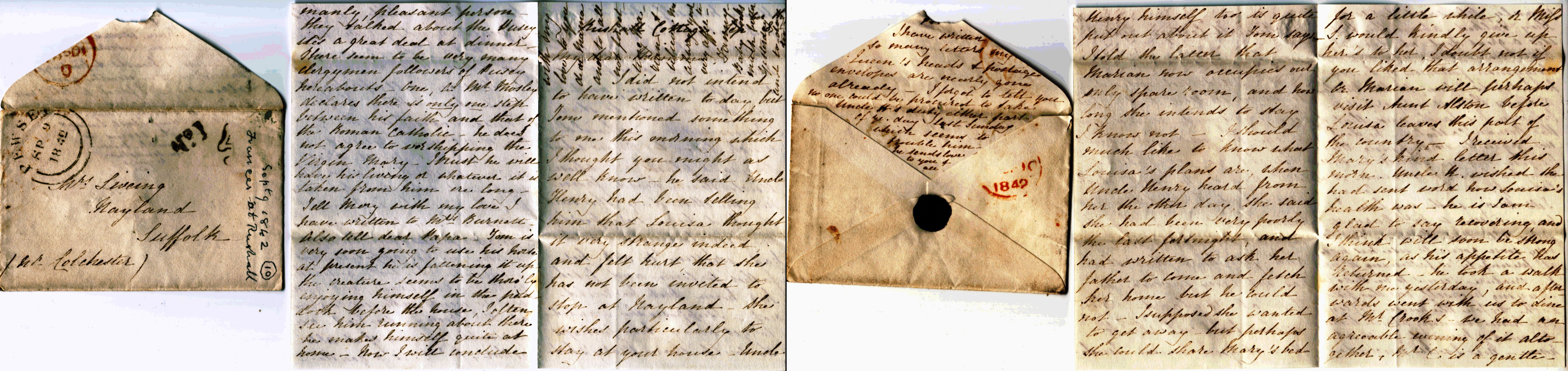 10. Frances (Fanny) Liveing: Letter to her mother, 10 Sep 1842, Rushall WIL. Mrs Liveing Nayland Suffolk (nr Colchester) Rushall Cottage Sepbr 10 My dear Mamma I received your note this morning and am somewhat puzzled to know how to answer it - Robert intends leaving Rushall Monday week, that he may spend two or three days at Horksley Park with his mother if I come up to London with him, I shall only have spent three weeks here exactly, which is a very short time to stay when one considers the long journey and great distance from Nayland - I made up my mind on coming here to stop a month or at the furthest five weeks - I have mentioned your proposal to Tom and Marie the former says he will undertake to see that I get home safely but how he will manage this I can't say I can see (say) how much I wish Robert could spend another week here - I am really troubled not knowing what to do about leaving in one weeks time, for I seem to be only just arrived - Uncle Henry left us today, Tom drove him to Devizes and he took a coach from thence to Chippenham, he hoped to get to Uxbridge in good time - I think he will soon be quite strong again, his spirits have been very good lately - I hope before you receive this note dear Ellen will be quite herself - I am glad to say Isabella has improved very much this last week - she looks better altogether - thanks to dear Nanny for her letter - I am glad you have arranged for the Louisa's coming to Nayland. Maria desires me to say Tom will see me into . . . . . the train when the time comes for one to go - If he will do this I shall not mind travelling alone to London, as I trust Uncle William will be so kind as to meet me there - I suppose in this case I must give up staying at Camberwell this year, as Uncle's holidays begin so shortly - I am sorry to miss seeing Louisa again - now dear Mamma if after reading this you think it would be a much better plan to come up with Robert write and say so directly & I will be ready to come though I shall leave reluctantly - I must say goodbye for tonight with kind love to yourself and believe me my dear Mamma your very affectionate Fanny PS I have written this ready for tomorrow morning's post. Maria and Robert join me in kind love to all the Nayland and kisses to baby - Tom is gone to bed not being quite well - he pretends to make us think this constitution is gradually breaking up - however Maria is not frightened. Written on four sides by small notepaper and on the inside of the opening flap of the envelope. The envelope (11.5cm x 7cm) shows a Pewsey postmark plus two others confirming the date at 1842, a one penny franked stamp, it was closed with a black seal. An unsigned note reads "September 10 1842 Frances at Rushall" Original in Fenn archive.