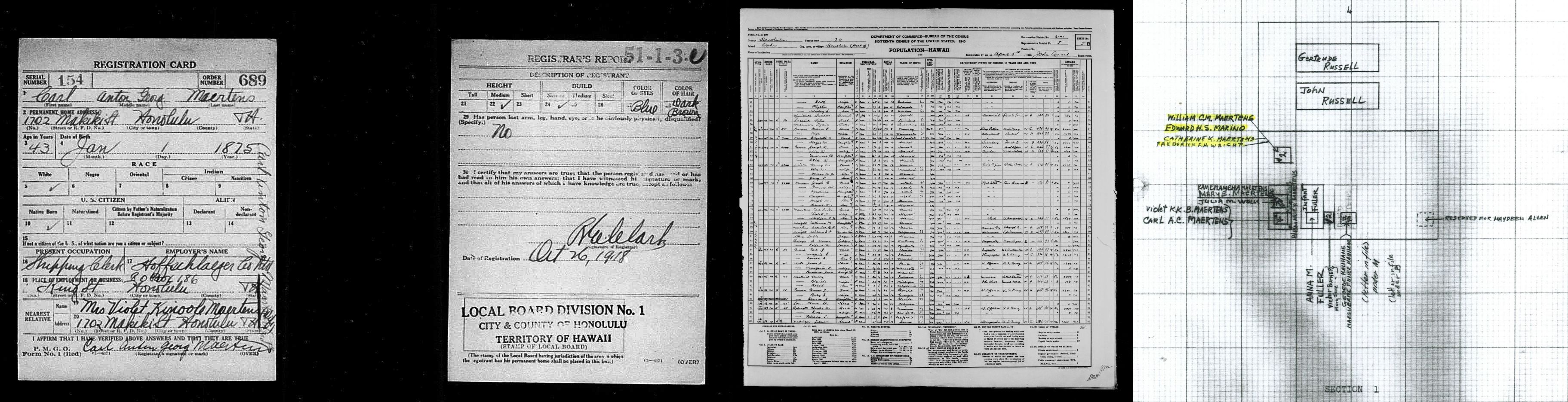 5. Carl Anton George Maertens. WWI Draft registration for Hawaii 1918, 1940 Census paper, Plan for headstone site O'ahu Cemetery Honolulu Co Hawaii.