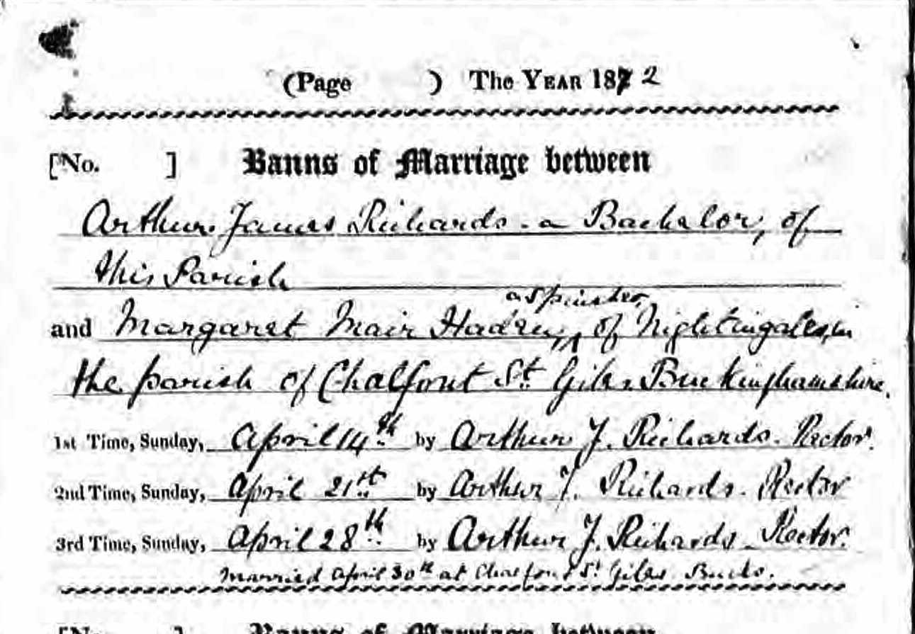 Margaret married Rev Arthur James RICHARDS [22137] [MRIN: 7953], son of Rev Edward Tew RICHARDS [21901] and Horatia HASLEWOOD [22131], on 30 Apr 1872 in Chalfont St Giles BKM. (Rev Arthur James RICHARDS [22137] was born on 26 Sep 1843 in Farlington HAM, baptised on 12 Nov 1843 in Farlington HAM and died on 19 Nov 1928 in East Lodge Farlington HAM.) |