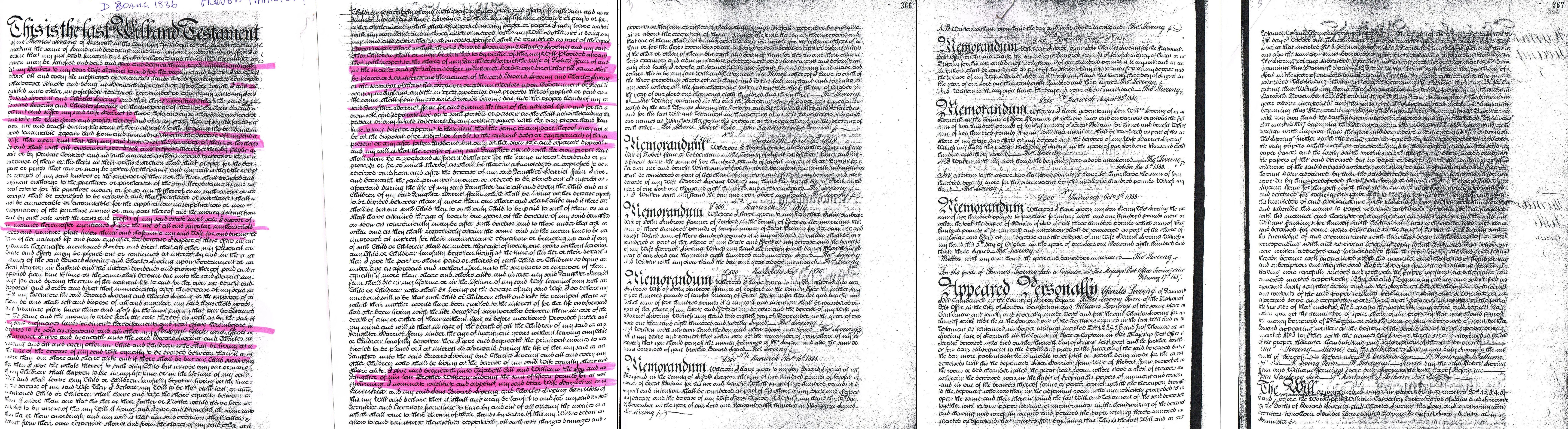 Appeared Personally: Charles Liveing of Danmark Hill Camberwell Esq, Robert Liveing Fenn of the National Debt Office in the city of London Gentlemen & William Jennings of the same place Gentlemen and jointly and severally made Oath and the first the said Charles Liveing for himself saith that he is the son and one of the executors named in the last Will and Testament as containing in paper writings marked Nos 1,2,3,4,5,6 and 7 of Thomas Liveing late of Harwich in the County of Essex a Captain in his Majesty's Post Office Service deceased who died on the 30th day of August last past and he further saith have few days subsequent to the death and prior to the funeral of the said deceased but the day he more particularly he is unable to set forth on search being made for the deceased's Will his the deponents sister Harriet Fenn wife of Robert Fenn proceeded to the room or bedchamber called the great front room where stood a chest of drawers wherein the deceased was in the habit of keeping his papers of moment and in one of the drawers thereof found a paper parcel which she thereupon brought to the deponent who was then in the adjoining room who immediately proceeded to open the same and then therein found the last Will and Testament of the said deceased together with certain paper writings or memoranda in the handwriting of the deceased and having now carefully viewed and perused the paper writings hereto annexed marked as aforesaid that marked No1 beginning thus this is the last Will and Testament of me Thomas Liveing of Harwich in the Co of Essex Esq aducing? thus this 11th day of Oct one thousand eight hundred and thirty five and thus subscribed Thomas Liveing that marked No 3 beginning thus L300 herewith Mar 24 1819 ending thus and also the sum or sums borrowed of your brother Edward and having the name Thoms Liveing set and subscribed to the first and second sides thereof that marked No 2 beginning thus Harwich April 4th 1818 ending thus witness my hand this 4th day of April in the year of our Lord one thousand eight hundred and eighteen and thus inscribed Thoms Liveing that marked No 6 beginning thus Harwich August 23rd 1830 ending thus witness my hand Thoms Liveing that marked No 4 beginning thus Harwich November 16th 1821 ending thus . . . . . written with my own hand the day and year above mentioned and thus subscribed Thoms Liveing that marked No 5 in continuing this memorandum Harwich August 23 1830 ending thus . . . . . written with my own hand the day and year above mentioned and thus subscribed Thoms Liveing that marked No 7 beginning this memorandum Harwich Oct 5 1833 ending thus written with my own hand the year and day above mentioned and thus subscribed Thoms Liveing further saith the same are the papers by him predeposed of and are the only papers which were aforesaid found by him or contained in the said paper parcel and he lastly saith careful search hath sure been made among the papers of the said deceased but no paper or papers in the handwriting or otherwise of the said deceased whereby any sum or sums of money are specified as having been advanced by him the said deceased in his lifetime to his children save as by him predeposed have been found or discovered And the said Robert Liveing Fenn for himself saith that he knew and was well acquainted with the said deceased for some years prior and to the time of his death and during such his knowledge of and acquaintance with the said deceased often saw him right and subscribe his name to paper writings and thereby became well acquainted with his manner and character of handwriting and subscription and the said William Fennings for himself saith he knew and was well acquainted with the said deceased for some years prior and to the time of his death and during such his knowledge of and acquaintance with him has been in the habit of corresponding with and receiving letters in reply which he knows and believes were written addressed and forwarded to him the deponent by the said deceased and thereby became well acquainted with his manner and character of handwriting and subscription and they the said Robert Liveing Fenn and William Fennings having now carefully reviewed and perused the said paper writings now hereto annexed marked respectively 2, 3, 4, 5, 6 & 7 beginning ending and subscribed as aforesaid lastly say they verily and in the constructure? believe the whole body series and contents of the said paper writing beginning ending and subscribed as aforesaid save and except the words "turn over" appearing written at the foot of the first side of that marked No 3 as also the words "it is my desire and request that when you get the remainder of your share of my property that you should pay off the money borrowed off Mr Logan as also the sum or sums borrowed off your brother Edward" appearing written at the bottom of the second side of the said paper writing marked No 3 together with the names Thomas Liveing thereto set and subscribed to be all of the proper character handwriting and subscription of the said deceased Chas Liveing - same day the said Charles Liveing was duly sworn to the truth of hereof Before me W. C. Curtis Surv . . . . . Pt Montague J Fatham Ser . . . . . Pub. R Liveing Fenn W. Fennings same day that said Robert Liveing Fenn and William Fennings were duly sworn to the truth hereof before me John Laubeny Sivir . . . . . Pt Montague I Faltham Not . . . . . Pub