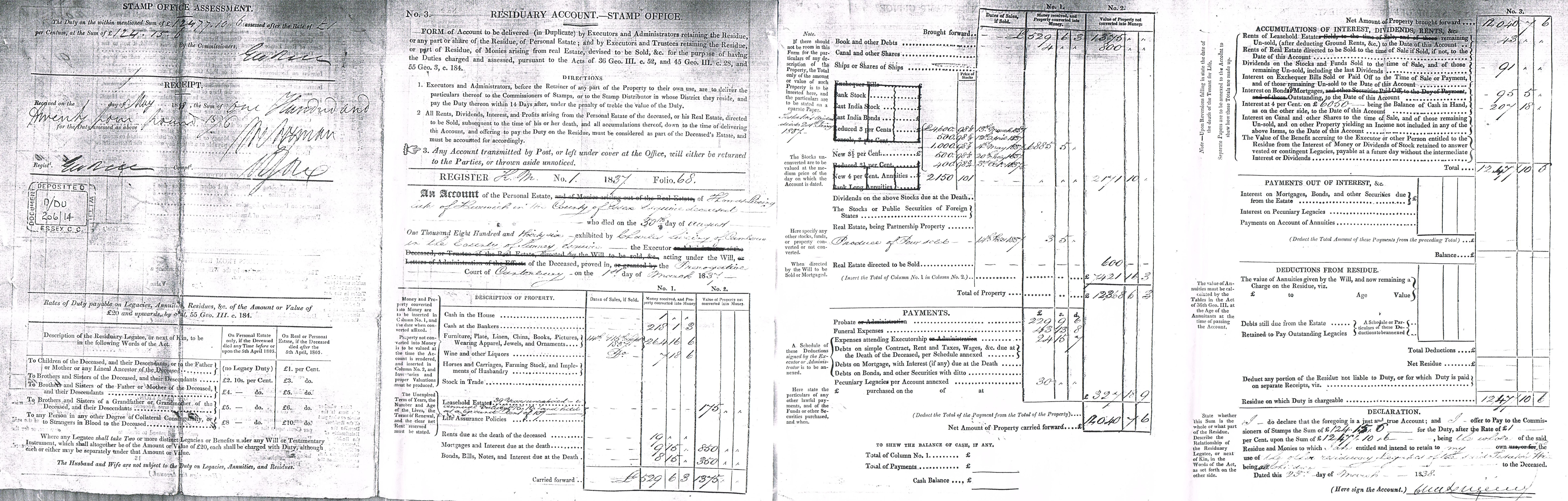 10. Thomas Liveing: Stamp Office Assessment of his Estate, 1 Mar 1837. The following is an brief account of the personal estate of Thomas Liveing at 1st Mar 1837. Cash - £218. Household effects - £272. Leasehold interests - £1375. Mortgages Bonds Annuities Interest Dividends etc - £10940. Probate & funeral expenses etc were £328, stamp duty of £125 was paid on the estate. Ref: ESS RO D/DU 206/14