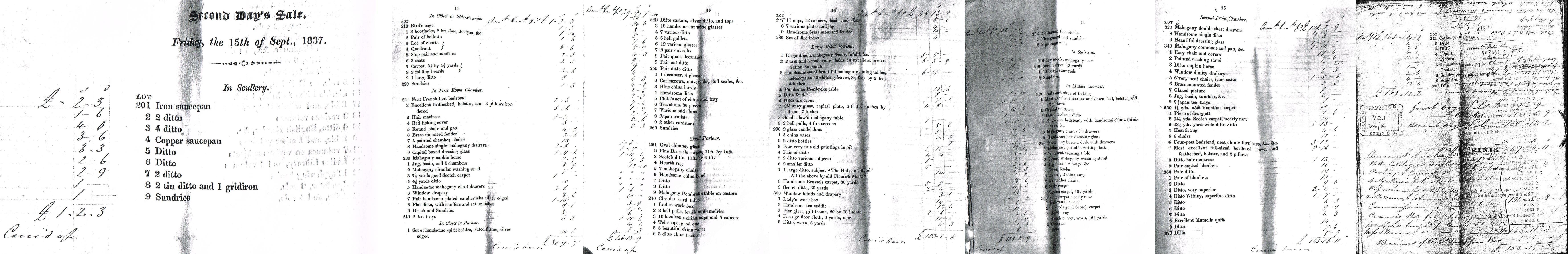 Essex Record Office D/DU 206/14 - a fascinating file of receipts insurance policys accounts and notes etc including: Sale catalogue of furniture of Captain Thomas Liveing, deceased, sold on the premises at King's Head Street, Harwich, 14-15 September 1837 (marked copy). A summary of receipts on page 16 shows the proceeds from the sale at L249-16-11 from some 370 lots, less expenses L27-9-9 and sales to family totaling L104-5-8 nett L145-11-3 plus the sale of a bed L5-5-0 total realised L150-16-3 approx.