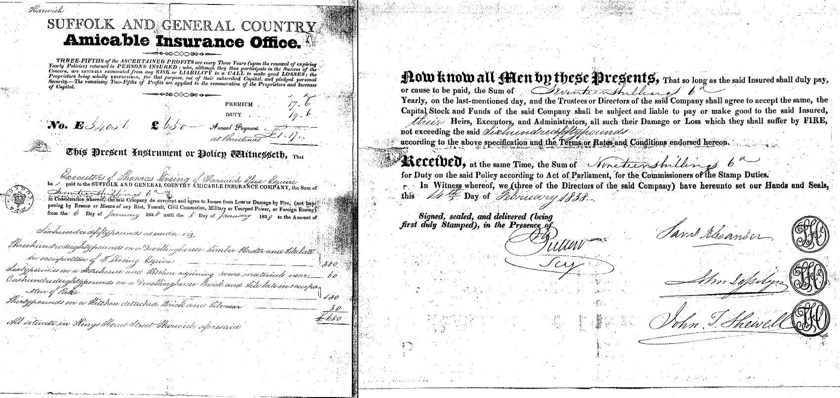 13. Thomas Liveing: House Insurance & Receipt, 1838 To 1839. Cover for two houses and their kitchens, 6 Jan 1838 to 5 Jan 1839. Timber plaster & tile house, Thomas's late dwelling £380 Storehouse & kitchen adjoining £60 Brick and tile house in occupation of Parker [?] £180 Kitchen detatched £30 Total cover £650 Premium 17s 6d plus Duty 19s 6d Total premium £1 17s 0d