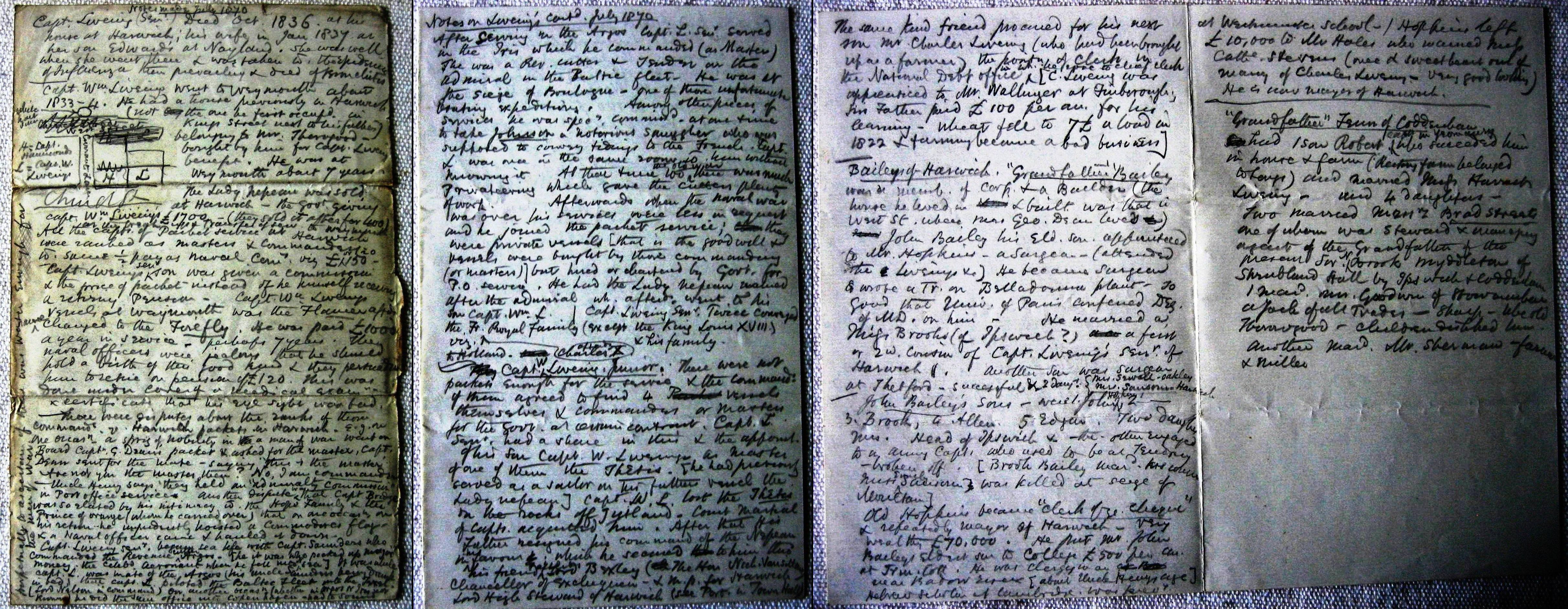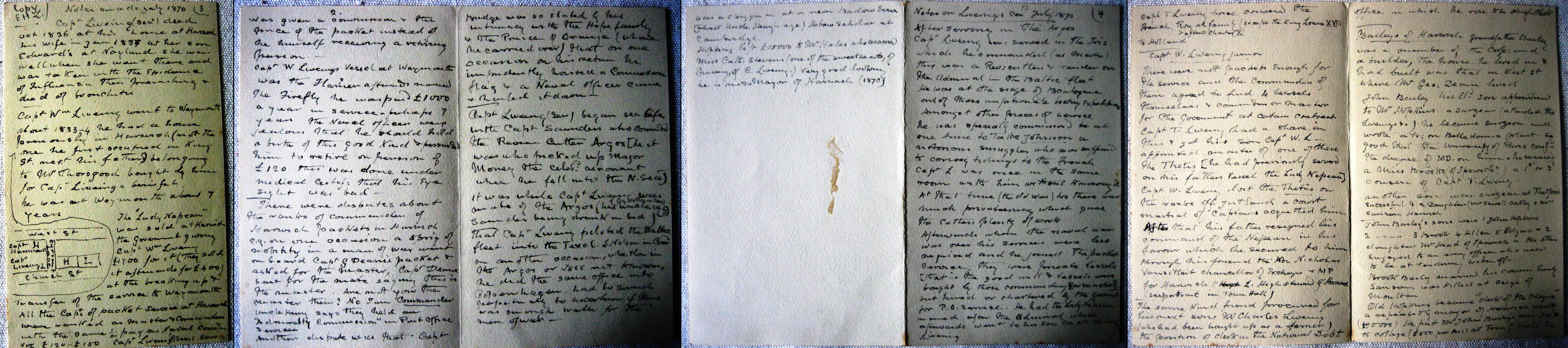 Notes made July 1870 by Edward Liveing FRCP. Capt Liveing (Snr) died October 1836 at his house at Harwich; his wife in January 1837 at her son Edward at Nayland. She was well when she went there and was taken with the epidemic of influenza then prevailing and died of bronchitis. Capt William Liveing went to Weymouth about 1833 - 34. He had a house previously in Harwich (not the one he first occupied, in King Street next to his father's) belonging to Mr Thorogood bought by him for Capt Liveing's benefit. He was at Weymouth about seven years. The Lady Nepean was sold, at Harwich, the Govt giving Capt William Liveing £1700 (they sold it after for £400) with the breaking up and transfer of the service to Weymouth. All the captains of packet service at Harwich were ranked as Masters and Commanders so to secure half pay as naval commanders viz £150 or £120. Capt Liveing senior son was given a commission and the price of packet instead of he himself receiving a retiring pension. Capt William Liveing's vessel at Weymouth was The Flavier a lady's name changed afterwards named the Firefly. He was paid £1000 a year in service perhaps seven years. The naval officers were jealous that he should hold a birth of this good kind and they persuaded him to retire on pension of hundred £120 this was done under cover of a medical exam and certificate that his eyesight was bad. There were disputes about the ranks of these commanders ye Harwich packets in Harwich. E.g. on one occasional sprig of nobility in a man of war went on Board Capt G Deane's packet and asked for the master, Capt Deane sent for the mate, saying this is the master. Are you not the master then? No, I am commander. Uncle Henry says they held an admiralty commission in post office services. Another dispute was that Capt Bridge was so elated by his intimacy to the Hope family and the Prince of Orange (whom he carried over) that on one occasion on his return, he impudently hoisted a Commodores flag and a naval officer came and hauled it down. Capt Liveing Snr began sea life with Capt Saunders who commanded the Revenue Cutter Argus. (He it was who picked up Major Money1, the celebrated Aeronaut when he fell into the N. sea) it was while Capt Liveing was mate of the Argus (his uncle Saunders being drunk in bed) that Capt Liveing (his brother-in-law) piloted the Baltic fleet into the Texel. (Lord Nelson in command) on another occasion whether on the Argos or the Isis not known, he did the same office into Copenhagen had to sound perpetually to ascertain if there was water enough for the men of war. Page 2. After serving in the Argos Capt Liveing Snr served in the Iris which he commanded (as Master). She was a rev [enue] Cutter and tender on the Adml in the Baltic fleet. He was at the siege of Boulogne, one of those unfortunate boating expeditions. Amongst other places of service he was specially commissioned, at one time to take Johnson a notorious smuggler who was supposed to convey tidings to the French, Capt Liveing was once in the same room to him without knowing it. At that time (the old war) too there was much privateering which gave the cutters plenty of work. Afterwards when the naval war was over his services were less in request and he joined the packet service; they were private vessels (that is the goodwill and vessels were bought by those commanding (or masters) but hired or chartered by Govt, for P.O. service. He had the Lady Nepean named after the admiral which afterwards went to his son Capt William Liveing. Capt T Liveing Snr twice conveyed the French Royal Family (except the King Louis XVIII) viz, afterwards? Charles X and his family to Holland.