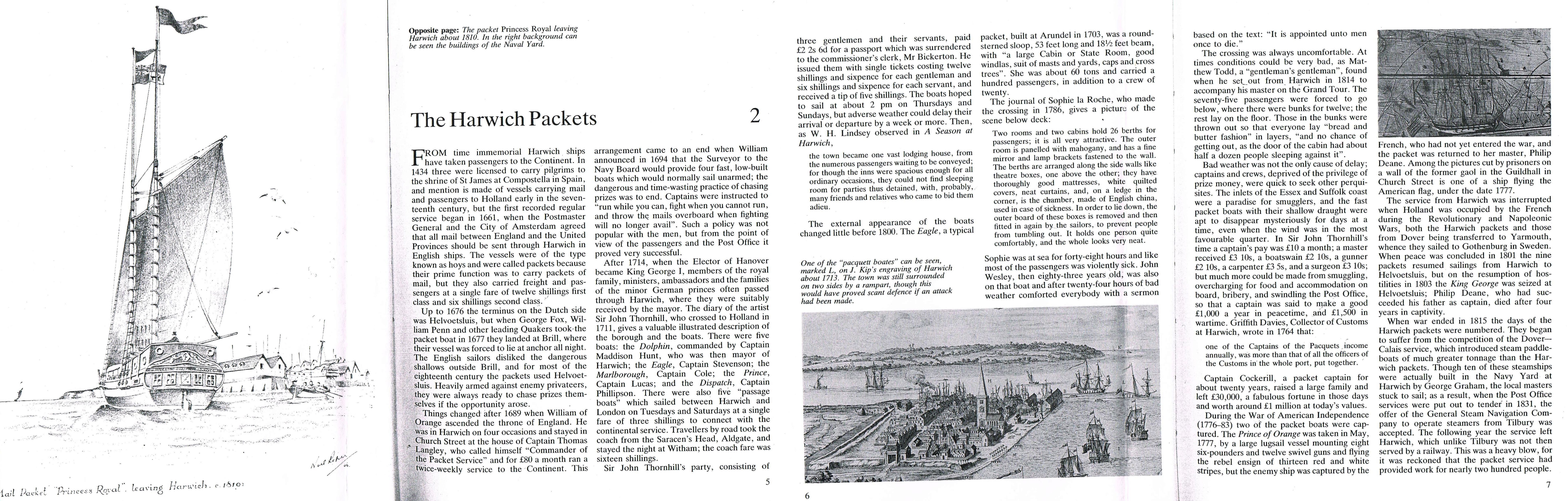 3. Capt Thomas Liveing: A Cutter Harwich, Notes on the Battle of Camperdown, 1797. Defoe wrote in 1724: "Harwich is known for being the port when the Packet Boats between England and Holland go out and come in", but it was impossible to say exactly when a ship would leave or arrive. Bad weather and adverse winds often delayed sailing for a week or more and then "the town became one vast lodging house, from the numerous passages waiting to be conveyed; although the inns were spacious enough for all ordinary occasions, they could not find sleeping room for parties thus detained, with, probably many friends and relatives who came to bid them adieu." (Lindsey p.35) However, Defoe had no cause for complaint, "having myself received no civiler entertainment than I have had their". Royalty passed through the town to and from Europe. Ref: The Harwich Story, by L T Weaver.