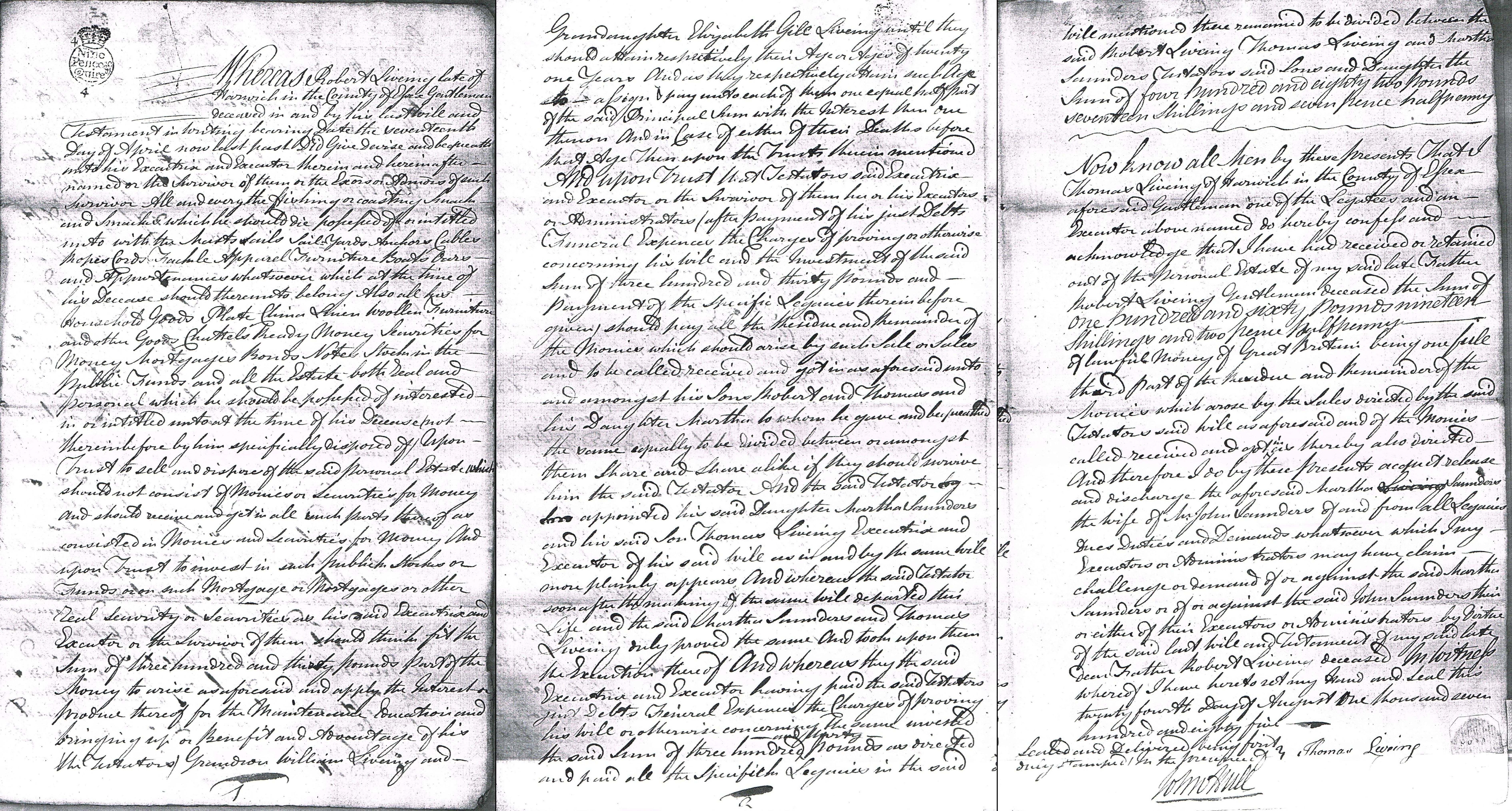 2. Thomas Liveing: Receipt and Discharge for Legacy from his father Robert Liveing [427], 24 Aug 1785, Harwich. Whereas Robert Liveing late of Harwich in the County of Essex gentlemen deceased in and by his last will and testament in writing bearing date the 17th day of April now last past did give devise and bequeath unto his Executrix and Executor therein and hereinafter named or the survivor of them all the executors or administrators of such survivor All and every the fishing and coasting smack and smacks which he should die possessed of or entitled unto with the masts sales saleyards anchors cables ropes cords tackle apparel furniture boats oars and appurtenances whatsoever which at the time of his decease should thereunto belong Also all his household goods plate china linen woollen furniture and other goods chattels ready money securities for money mortgages bonds notes stock in the public funds and all the estate both real and personal which he should be possessed of interested in or entitled unto at the time of his decease (not therein before by him specifically disposed of) Upon Trust to sell and dispose of the said personal estate which should not consist of monies or securities for money and should receive and get in all each parts thereof as consisted in monies and securities for money And upon trust to invest then such public stocks or funds or on such mortgage or mortgages or other real security or securities as his said Executrix and Executor or the survivor of them should think fit the sum of £330 part of the money to arise as aforesaid and apply the interest or produce thereof for the maintenance education and bringing up or benefit and advantage of his the testator's grandson William Liveing and grand daughter Elizabeth Gill Liveing until they should attain respectively their age or ages of 21 years and as they respectively attain such age to assign pay unto each of them one equal half part of the said principal sum with the interest thereon and in case of either of their deaths before that age then upon the trusts therein mentioned and upon trust that Testator's said Executrix and Executor or the survivor of them her or his Executors or Administrators (after payment of his just debts funeral expenses the charges of proving or otherwise concerning his will and the investment of the said sum of £330 and payment of the specific legacies therein before given) should pay all the residue and remainder of the monies which should arise by such sale or sales and to be called received and got in as aforesaid unto and amongst his sons Robert and Thomas and his daughter Martha to whom he gave and bequeathed the same equally to be divided between or amongst them share and share alike if they should survive him the said Testator soon after the making of the same will departed this life and the said Martha Saunders and Thomas Liveing only proved the same and took upon them the execution thereof And whereas they the said Executrix and Executor having paid the said Testator's just debts funeral expenses the charges of proving his will or otherwise concerning the same invested the said sum of £330 as directed and paid all the specific legacies in the said will mentioned there remained to be divided between the said Robert Liveing Thomas Liveing and Martha Saunders testator's said sons and daughter the sum of 482pounds 17shillings and 7pence half penny. Now know all men by these presents that I Thomas Liveing of Harwich in the County of Essex aforesaid gentlemen one of the legatees and an executor above do hereby confess and acknowledge that I have had received or retained out of the personal estate of my said late father Robert Liveing gentlemen deceased the sum of £160 19s 2½d being one full third part of the residue and remainder of the monies which arose by the sales directed by the said testator's said will as aforesaid and of the monies called received and got in as thereby also directed And therefore I do by these presents acquit release and discharge the aforesaid Martha Saunders the wife of Mr John Saunders of and from all legacies dues duties and demands whatsoever which I my executors or administrators may have claim challenge or demand of or against the said Martha Saunders or of or against the said John Saunders their or either of their executors and administrators by virtue of the said last will and testament of my said late dear father Robert Liveing deceased. In witness whereof I have hereto set my hand and seal this 24th day of August 1785. Thomas Liveing Sealed and delivered being first duly stamped on the presence of John Hull. Ref ESS RO 1775 D/DU 206/10 - 2003