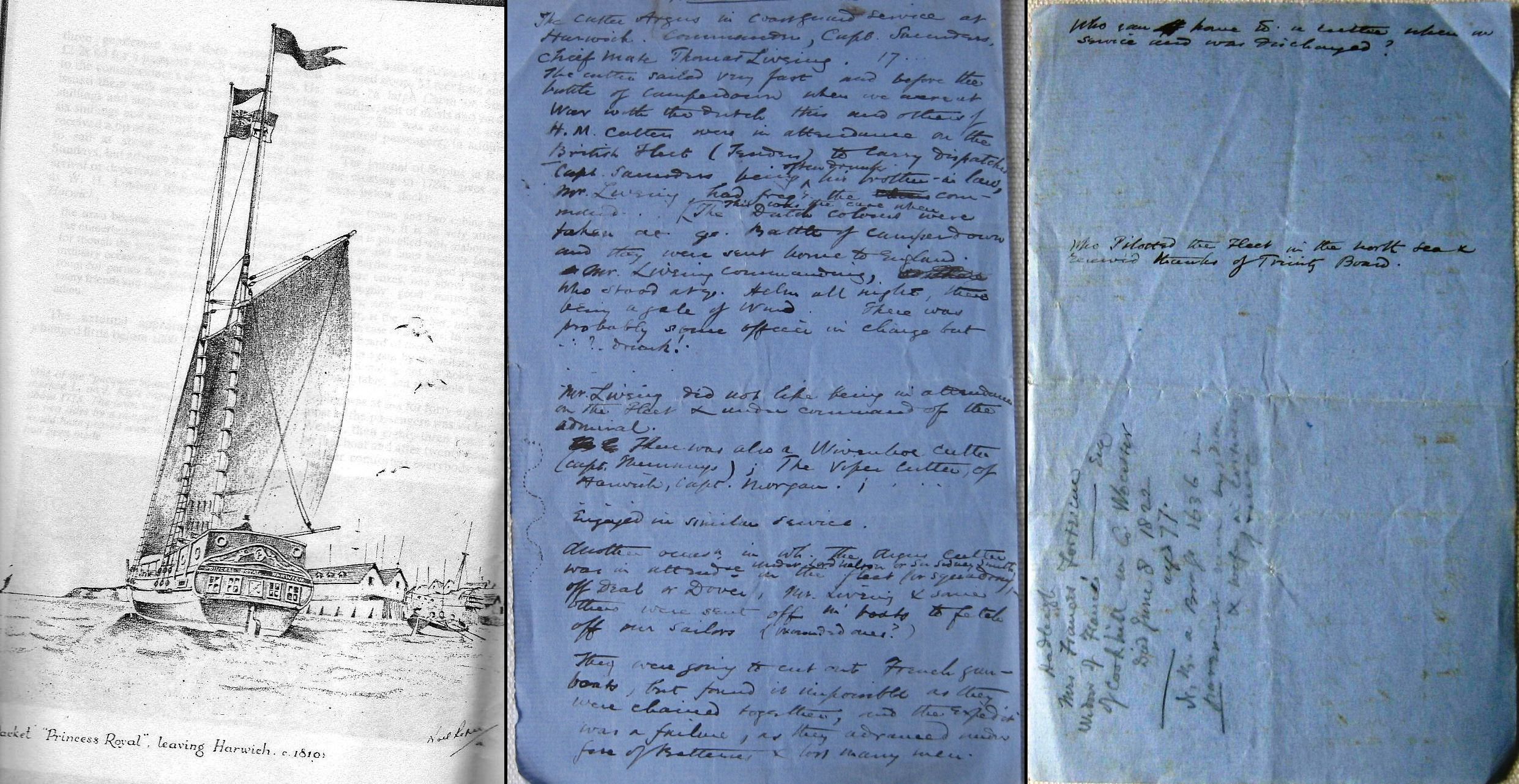 Notes on Thomas Liveing serving at the Battle of Camperdown1 11 Oct 1797. The Cutter Argus in Coastguard Service at Harwich Cmdr, Capt Saunders, Chief Mate Thomas Liveing. 17…. The cutter sailed very fast and before the Battle of Camperdown when we were at war with the Dutch this and others of H.M. Cutters were in attendance on the British Fleet (Tenders) to carry dispatches Capt Saunders being often drunk his brother in law Mr Liveing had frequently the command. This was the case when the Dutch colours were taken at ye battle of Camperdown and they were sent home to England Mr Liveing commanding who stood at ye helm all night, there being a gale of wind. There was probably some office in charge but drunk. Mr Liveing did not like being in attendance on the Fleet and under command of the Admiral. There was also a Wivenhoe Cutter (Capt Mannings?), The Viper cutter of Harwich Capt Morgan engaged in similar service Another occurred in which the Argus Cutter was in attendance under Lord Nelson or Sir Sydney Smith in the Fleet (or Squadron) off Deal or Dover, Mr Liveing and some others were sent off in boats to fetch off our sailors (Wounded ones?) They were going to cut out French gun boats but found it impossible as they were chained together, and the expedition was a failure, as they advanced under fire of Batteries and lost many sailors Who came home to ye Cutters? when . . . . . service and was discharged Who piloted the fleet in the North Sea and received thanks of Trinity Board. The compiler has been unable to validate this story but much of it is entirely possible
