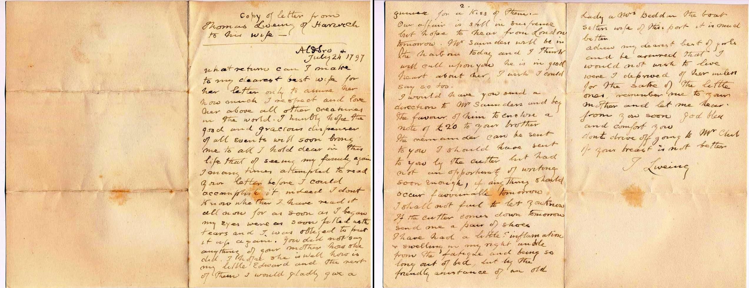 Letter from Thomas Liveing to his wife Harriet. Aldbro July 24 1797 What return can I make to my dearest best of wives for her letter only to assure her how much I respect and love her above all other creatures in the world. I humbly hope the good and gracious disposition of all events will soon bring me to her I hold dear in this life, that of seeing my family again I am many times attempted to read your letter before I could accomplish it, indeed I don't know whether I have read it all now for as soon as I began my eyes were as soon filled with the tears and I was obliged to put it up again. You do not say anything of your mother how she did I hope she is well how is my little Edward and the rest of them I would gladly give a guinea for a kiss of them. Our affair is still in suspense but hope to hear from London tomorrow Mr Saunders will be in the harbour today and I think will call upon you he is in good heart about her, I wish I could say so to. I would have you send a direction to Mr Saunders and beg the favour of him to enclose a note of L20 to your brother the remainder can be sent to you - I should have sent to you by the cutter but had not the opportunity of writing soon enough, if anything should occur favourable tomorrow I shall not fail to let you know. If the cutter comes down tomorrow send me a pair of shoes. I have had a little inflammation and swelling of my right ankle from the fatigue and being so long out of bed, but by the friendly assistance of an old lady a Mrs Beddon the boat setters wife of this port it is much better. Adieu my dearest best of girls and be assured that I would not wish to live were I dispossessed of her, unless for the sake of the little ones, remember me to your mother and let me hear from you soon. God bless and comfort you don't drive off going to Mr Club if you're breast is not better. T Liveing